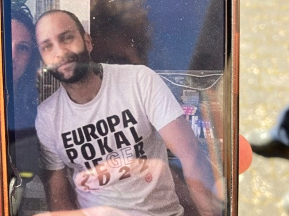 mĂ€nnlich, 175 cm groĂ, schlanke Statur, kurze schwarze Haare mit hoher Stirn, kurzer schwarzer Vollbart, am linken Unterarm ist der Name Nadine tĂ€towiert und am Hals ist der Eintracht Frankfurt Adler tĂ€towiert.