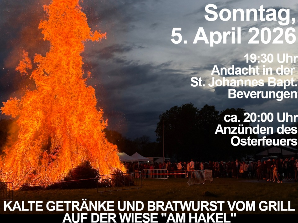 Beverungen - Auch in diesem Jahr wird das traditionelle Osterfeuer in Beverungen wieder in gewohnter Weise gefeiert. In bewährter Zusammenarbeit laden die katholische Kirchengemeinde "Heiligste Dreifaltigkeit" und der Feuerwehrverein St. Florian e.V. alle Bürgerinnen und Bürger herzlich zum Osterfeuer am Sonntag, den 5. April 2026, auf die Weserwiesen ein.