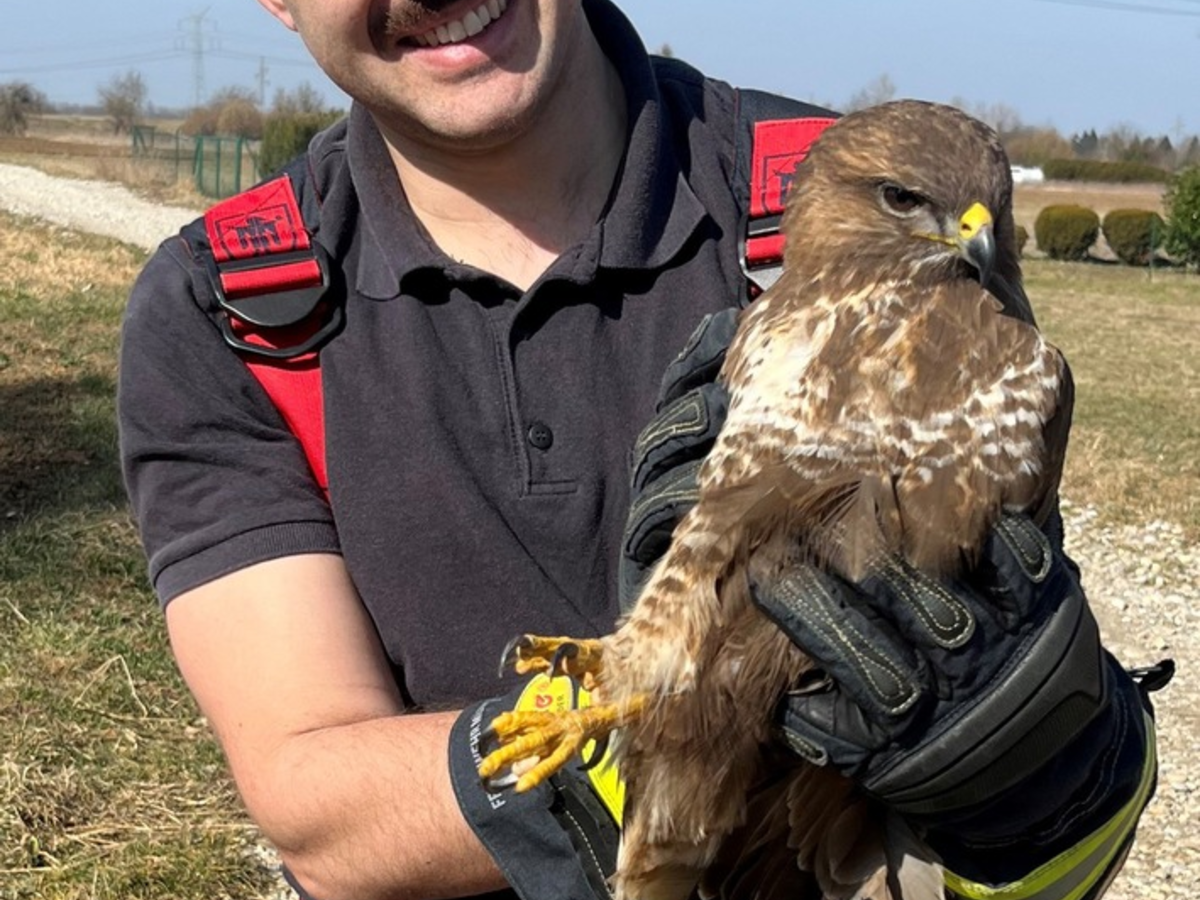 Ein MĂ€usebussard ist am Freitag in einem Schneefanggitter hĂ€ngen geblieben. Er musste von der Feuerwehr MĂŒnchen gerettet werden.