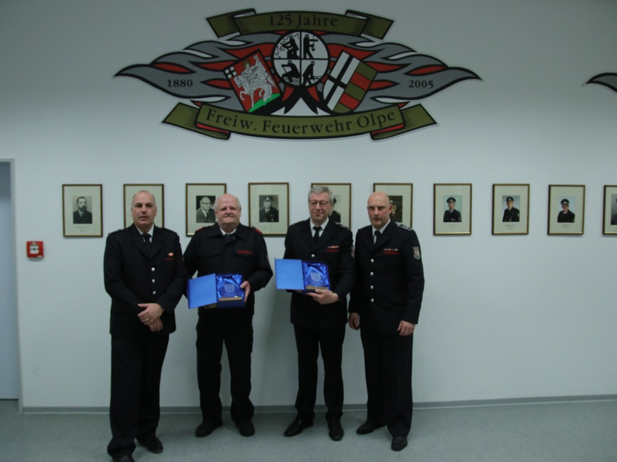 Abschließend warf ein weiteres besonderes Ereignis bereits seine Schatten voraus. So legt der stellvertretende Leiter der Feuerwehr Olpe Dirk Meiworm sein Amt zum 31.01.2026 nieder. Der Leiter der Feuerwehr Christian Hengstebeck würdigte und bedankte sich für seine jahrelange herausragende Arbeit. Zum 1.02.2026 treten Florian Schröder und Matthias Springmann die Nachfolge als stellvertretende Leiter der Feuerwehr an.