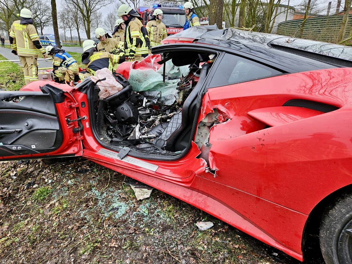 Olfen/Vinnum,Vinnumer Landweg,13. MÀrz 2024 - Am heutigen Nachmittag ereignete sich auf dem Vinnumer Landweg ein schwerer Verkehrsunfall, bei dem zwei Personen verletzt wurden. Um kurz vor 15:00 Uhr wurde die Feuerwehr Olfen alarmiert, nachdem ein Ferrari, mit zwei jungen MÀnnern, von der Fahrbahn abgekommen und gegen einen Baum geprallt war. Der Aufprall war so heftig, dass der Baum entwurzelt und in mehrere Teile zerfetzt wurde. Der Ferrari wurde beim Aufprall total zerstört und der Fahrer im Wrack eingeklemmt.
