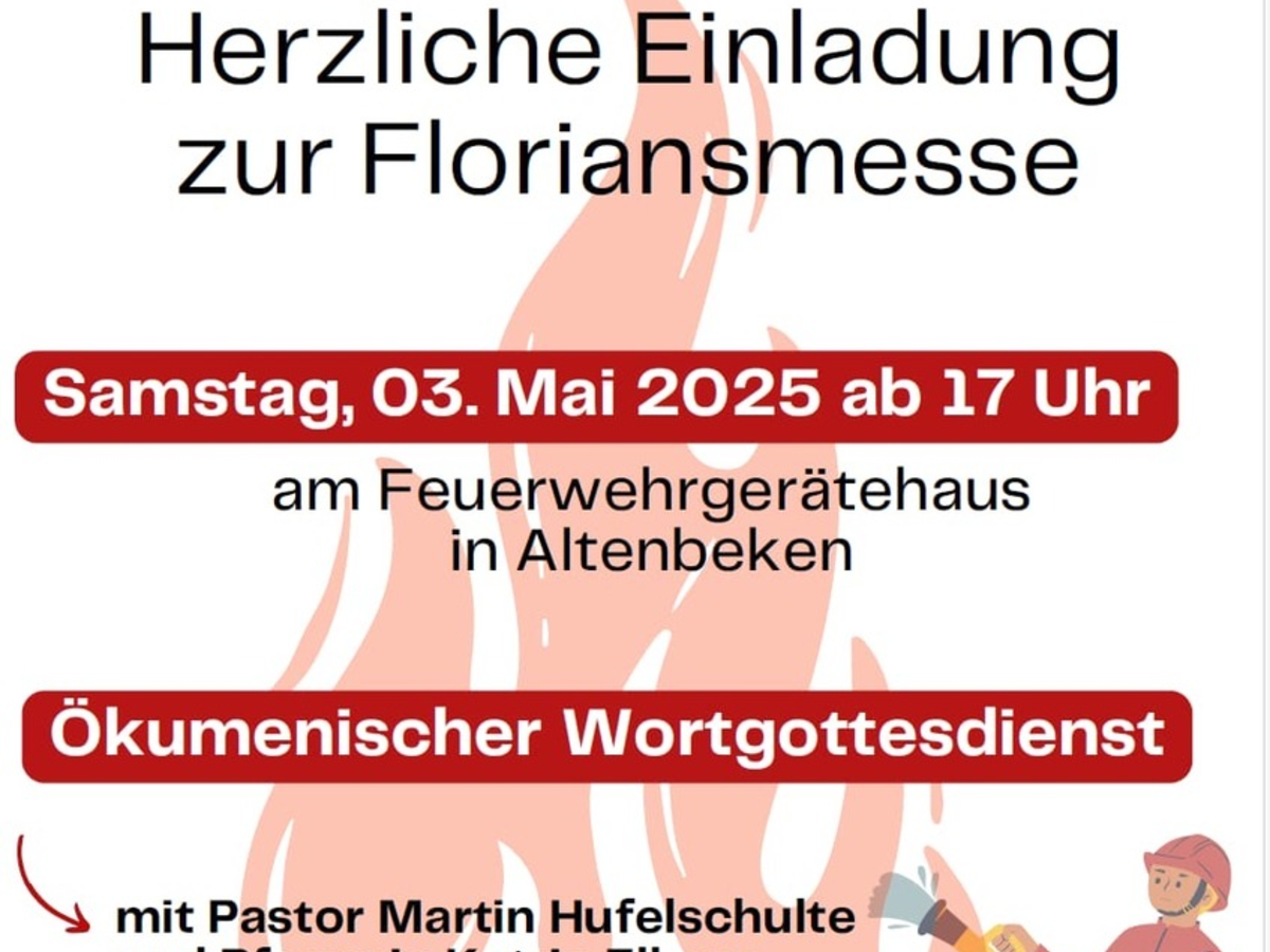 Am Samstag, den 03. Mai 2025 ab 17 Uhr, lädt der Löschzug Altenbeken herzlich zur Floriansmesse am Feuerwehrgerätehaus ein - einem ökumenischen Wortgottesdienst zu Ehren des heiligen Florian, Schutzpatron der Feuerwehr und Symbol für Mut, Einsatz und Nächstenliebe.