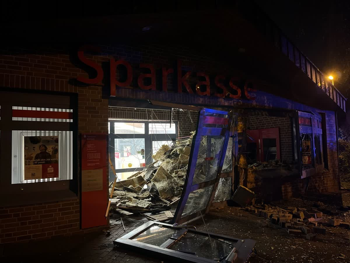 Unbekannte haben in der Nacht vom 11.11. auf den 12.11. einen Geldautomaten an der Josephinenstr. 42 in Bochum-Grumme gesprengt. Die Täter lösten gegen 02:50 Uhr einen Sprengsatz aus und beschädigten damit den Vorraum der Sparkasse, sowie die dort aufgestellten Geldautomaten. Am Gebäude entstand Sachschaden. Im Objekt befinden sich keine Wohnungen, Personen wurden durch die Sprengung nach ersten Erkenntnissen nicht verletzt. Die Dortmunder Polizei leitet den Einsatz. Die Kriminalpolizei des Polizeipräsidiums Dortmund hat die Ermittlungen aufgenommen und sichert am Tatort Spuren. Erkenntnisse zur Höhe der Tatbeute sind derzeit nicht möglich. Zeugen, die Hinweise zum Tatgeschehen, zu Tatverdächtigen oder möglichen Fluchtfahrzeugen machen können, melden sich bitte beim Kriminaldauerdienst des PP Dortmund unter der 0231/132-7441. Hinweis für Medienschaffende: Rückfragen zu dieser Pressemitteilung richten Sie bitte ab 6:30 Uhr an die Presse- und Öffentlichkeitsarbeit der Polizei Dortmund.