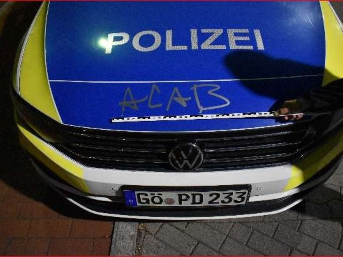 GĂTTINGEN (jk) - WĂ€hrend eines Einsatzes im Zusammenhang mit einer gemeldeten Ruhestörung hat ein Unbekannter Sonntagnacht (23.06.24) im FriedlĂ€nder Weg einen Funkstreifenwagen der Göttinger Polizei mit dem Schriftzug "ACAB", dem Akronym fĂŒr den Ausspruch "All cops are bastards", beschmiert. Zeugen beobachteten nach eigenen Angaben eine vermutlich etwa 20 Jahre alte, ca. 180 cm groĂe, dunkel gekleidete, mĂ€nnliche Person bei der TatausfĂŒhrung und teilten dies den Beamten mit, als sie zu ihrem Einsatzfahrzeug zurĂŒckkehrten. Eine sofort nach dem mutmaĂlichen SachbeschĂ€diger eingeleitete Fahndung verlief ergebnislos.
