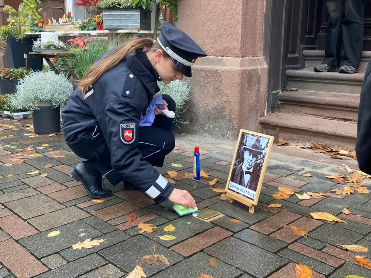 Am 85. Jahrestag der nationalsozialistischen Verbrechen erneuerten Tamara Tita, Ilka Simson und Steffen Jach, als "Demokratiepaten" der Polizei Goslar, mit dem Putzen des Stolpersteins und der Niederlegung eines Blumenstraußes nun dieses Zeichen der immerwährenden Verpflichtung.