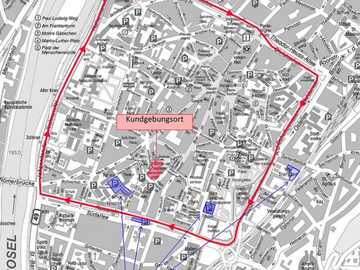 Nach der "rollenden" Versammlungslage werden die Teilnehmenden ab dem späten Vormittag eine stationäre Kundgebung auf dem Viehmarktplatz abhalten. Der Bereich zwischen der Kreuzungsanlage Kaiserstraße/Gerty-Spies-Straße und Kreuzung Fleischstraße/Brückenstraße wird frühzeitig komplett gesperrt und nicht befahrbar sein (auch Augustinerhof/Rathaus).