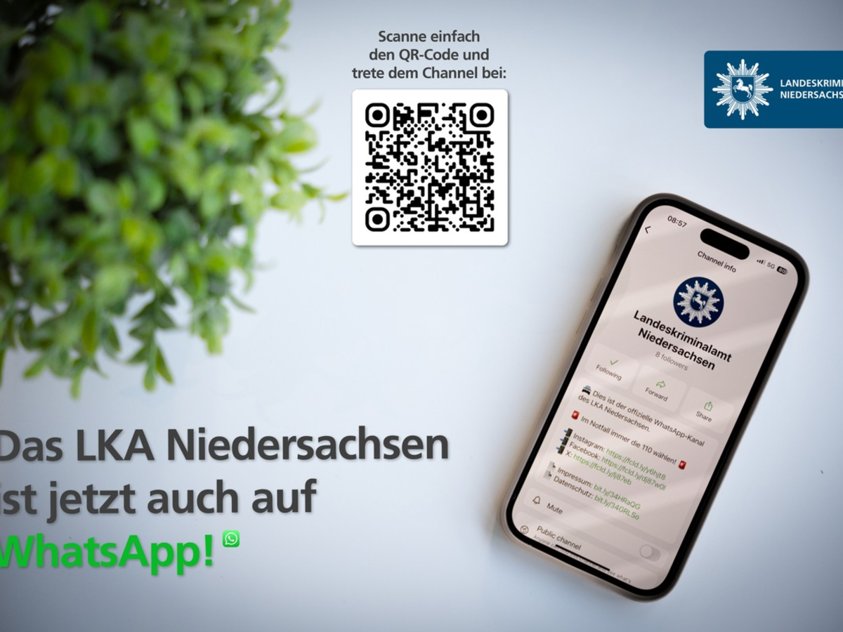 Den WhatsApp-Channel des LKA Niedersachsen erreichen Sie ĂŒber den folgenden Link: https://www.whatsapp.com/channel/0029Vame73z7DAWxwu0FpV2N