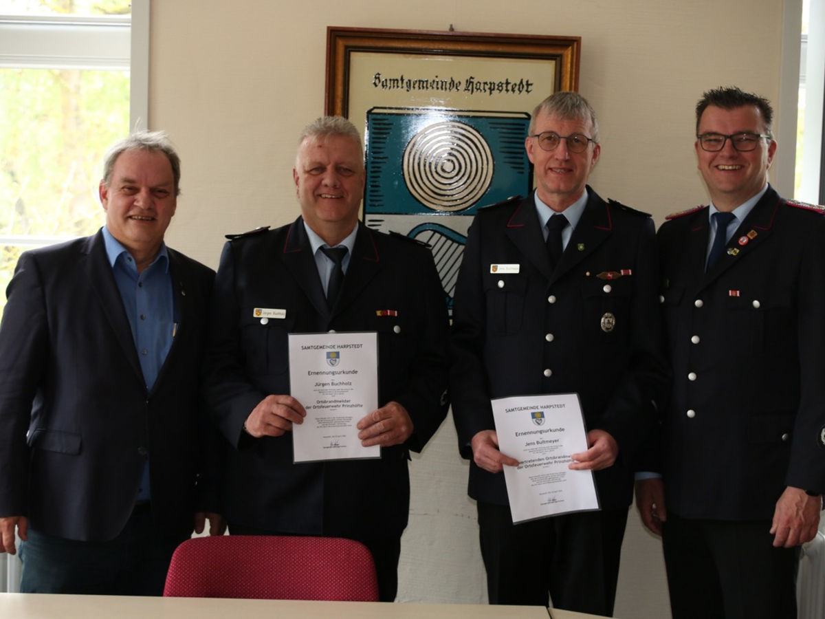 Im Rahmen einer kleinen Feierstunde ernannte Samtgemeindebürgermeister Yves Nagel die beiden erneut für weitere sechs Jahre zum Ortsbrandmeister beziehungsweise stellvertretenden Ortsbrandmeister und berief sie in das Ehrenbeamtenverhältnis.