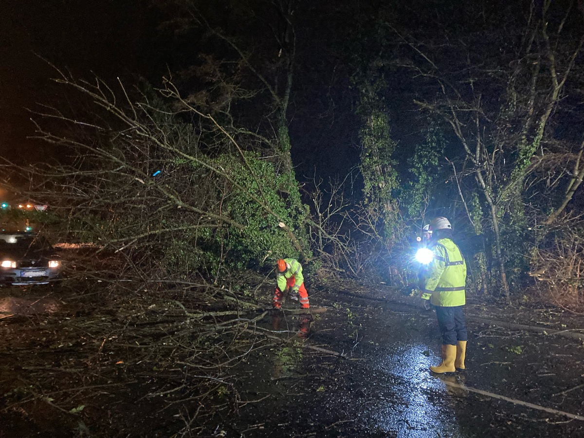 Nachdem die BÀume zersÀgt waren, wurden diese bei Seite gerÀumt und die Fahrbahn grob gereinigt. Die KrÀfte der Feuerwehr waren rd. eine Stunde im Einsatz.