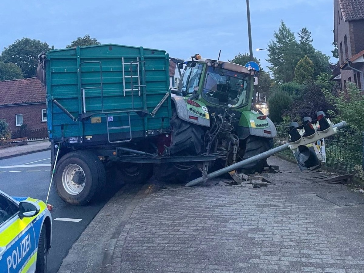 Soltau: Am Montagmorgen befuhr ein Treckergespann, beladen mit Karotten, die LĂŒneburger StraĂe stadteinwĂ€rts. Kurz vor der Kreuzung zum Oeninger Weg/zur Harm-Tyding-StraĂe geriet das Gespann ins Schlingern und kam schlussendlich von der Fahrbahn ab. Dabei kollidierte es mit der dortigen Ampelanlage. Bei dem Unfall wurde niemand verletzt. Es kam bis zur Bergung des Gespanns zu Verkehrsbehinderungen.
