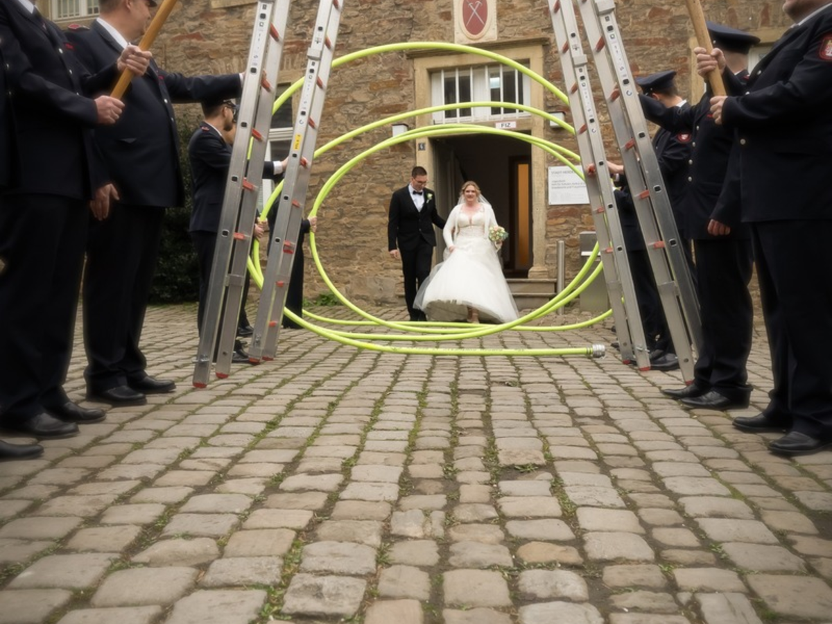 Seit einigen Jahren ist das Paar in der Einsatzabteilung der Freiwilligen Feuerwehr Herdecke aktiv. So gehörte es sich traditionell, dass die Kameradinnen und Kameraden der Feuerwehr Herdecke nach der standesamtlichen Trauung Spalier standen. Schlauchringe, Steckleiterteile und zwei Feuerwehräxte bildeten das Spalier.