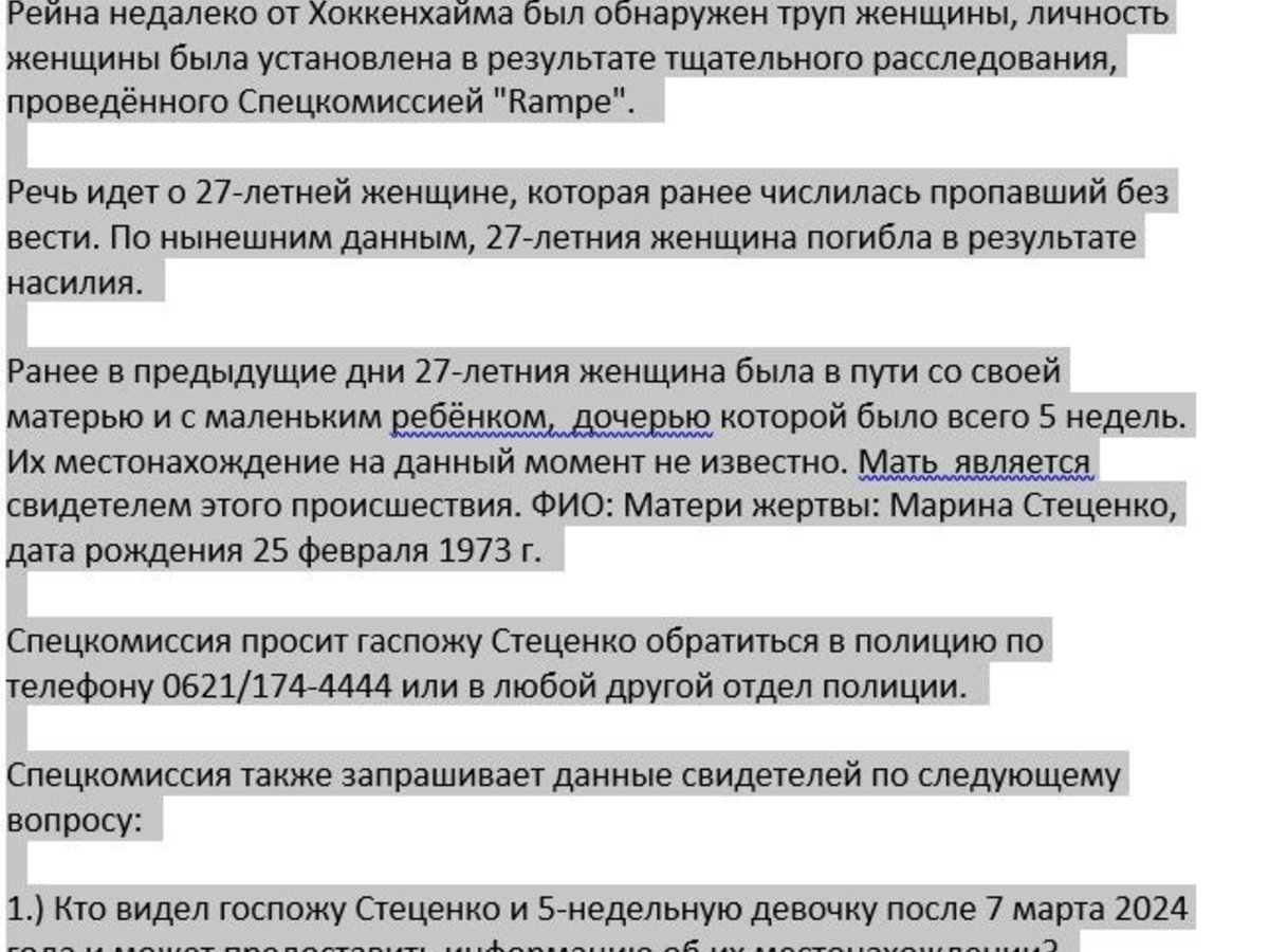 Die Sonderkommission bittet darum, dass sich Frau Stetsenko mit der Polizei unter der Telefonnummer 0621/ 174- 4444 oder jeder anderen Polizeidienststelle in Verbindung setzt. Weiterhin bittet die Sonderkommission um Zeugenhinweise zu folgender Frage: