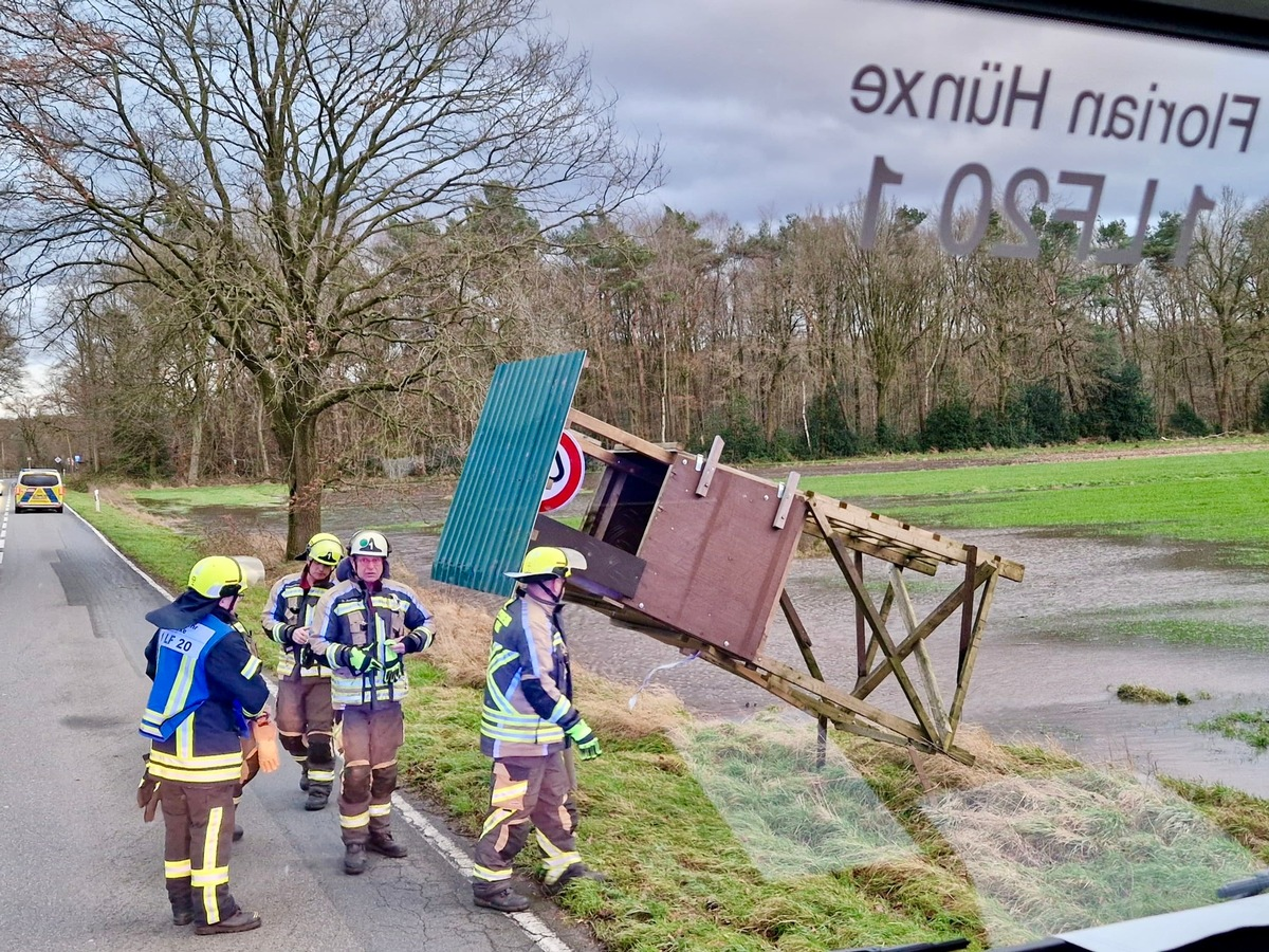 Die Einheit Hünxe wurde zudem um 16:11 Uhr zu einem umgestürzten Hochsitz an der Wilhelmstraße alarmiert. Da dieser auf die Straße zu wehen drohte, wurde der Hochsitz von den Einsatzkräften demontiert und weiter im Feld abgelegt.