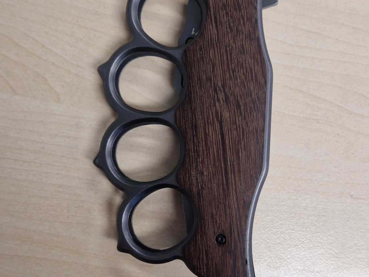 "Das sichergestellte sogenannte Grabenmesser kombiniert zwei Waffen. Einerseits den Schlagring, andererseits das Messer, dessen ĂŒber 8,5 Zentimeter lange Klinge per Knopfdruck aus dem GriffstĂŒck herausspringt." erklĂ€rt Sonja MĂŒller, Pressesprecherin des Hauptzollamts. "Sowohl diese Art Springmesser als auch der Schlagring sind nach dem Waffengesetz verboten."