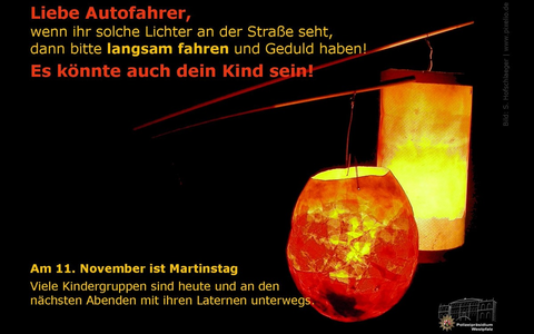 Die Teilnehmenden von Laternenumzüge werden gebeten, auch auf dem Weg zu ihrem Treffpunkt oder später zurück zum Auto, sich, wenn möglich, auf dem Gehweg und nicht auf der Straße aufzuhalten. Zusätzlich wird eine bei Dunkelheit gut zu erkennende Kleidung empfohlen.