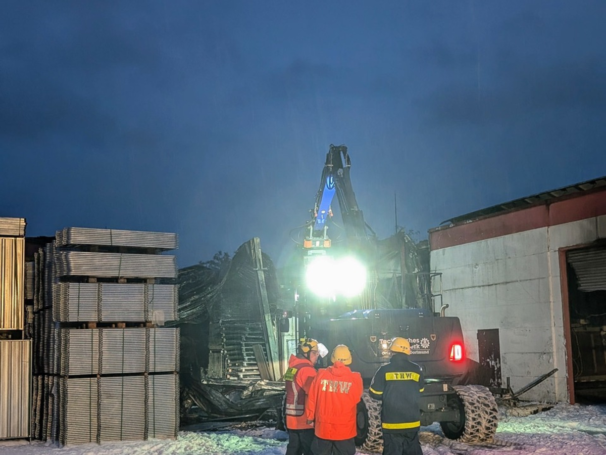 Nach Messungen des Brandrauchs von der Feuerwehr und des LANUVs NRW konnte Entwarnung für die Bevölkerung gegeben werden. Nachdem die Feuerwehr meldete "Feuer unter Kontrolle", wurden Baufachberater und Statiker des THW zur Beratung hinzugezogen. Sie überprüften die Standfestigkeit der Lagerhalle und orderten einen Bagger zur Einsatzstelle. Dieser unterstütze bei der Entnahme von Brandgut aus dem betroffenen Bereich und ermöglichte den Einsatzkräften Zugang zu den letzten Brandnestern. Um ca 2:30 wurde "Feuer aus" gemeldet und die letzten ehrenamtlichen Einsatzkräfte verliessen nach über 14 Stunden die Einsatzstelle.