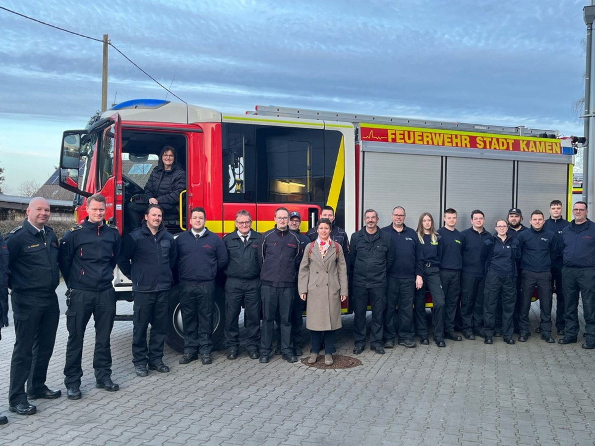 An der feierlichen Übergabe nahmen neben Bürgermeisterin Kappen auch Feuerschutzdezernentin Hanna Schulze, der Leiter der Feuerwehr Volker Rost, die Leiter des Fachbereichs 37, Christopher Lindermann und Frank Siedhoff, sowie die Löschzugführung Manfred und Sven Eder, die Einheitsführung Markus Schygulla und Jonas Fuhrmann und die Mitglieder der Einheit Kamen-Methler teil.