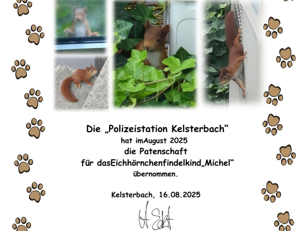 Eine Ordnungshüterin verständigte umgehend den Tierschutzverein. "Michel", wie das Eichhörnchen mittlerweile getauft wurde, war nicht verletzt, wurde aber dennoch vorsorglich von den Polizisten ins Tierheim gebracht. "Michel" lebt dort jetzt erst einmal bei gleichaltrigen Artgenossen in einer Voliere. Die Patenschaft für das Findelkind haben die Beamtinnen und Beamten der Polizeistation Kelsterbach nun auch gleich übernommen und hierzu zudem 100 Euro für seine Pflege gespendet.