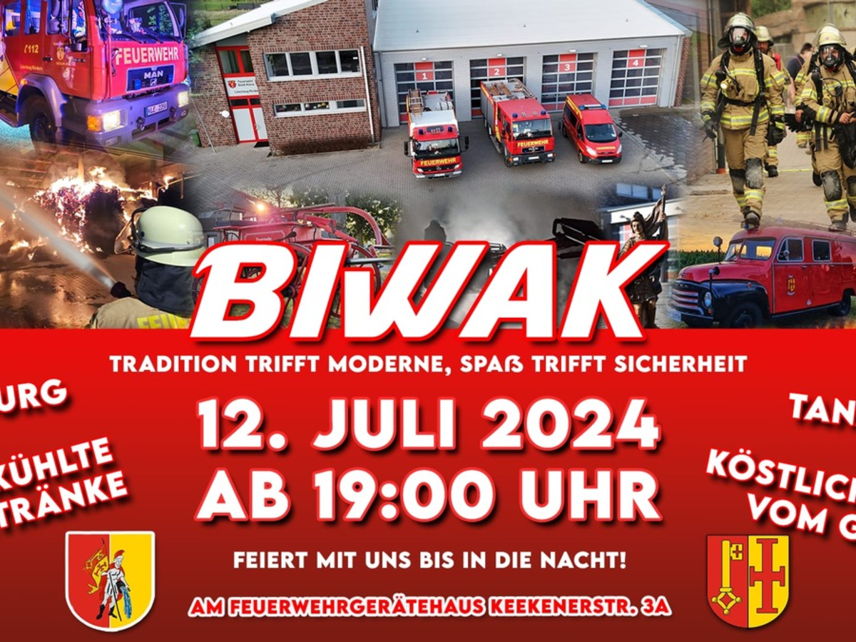Herzlich willkommen zum "Biwak" des Löschzuges Rindern! Wir laden Sie ein, gemeinsam mit uns am Freitag, den 12.7.2024 ab 19:00 Uhr, einen geselligen Sommerabend zu erleben. Unser Biwak ist ein Fest für Jung und Alt und findet auf dem Freigelände am Feuerwehrhaus in Rindern, Keekener Straße 3a statt.