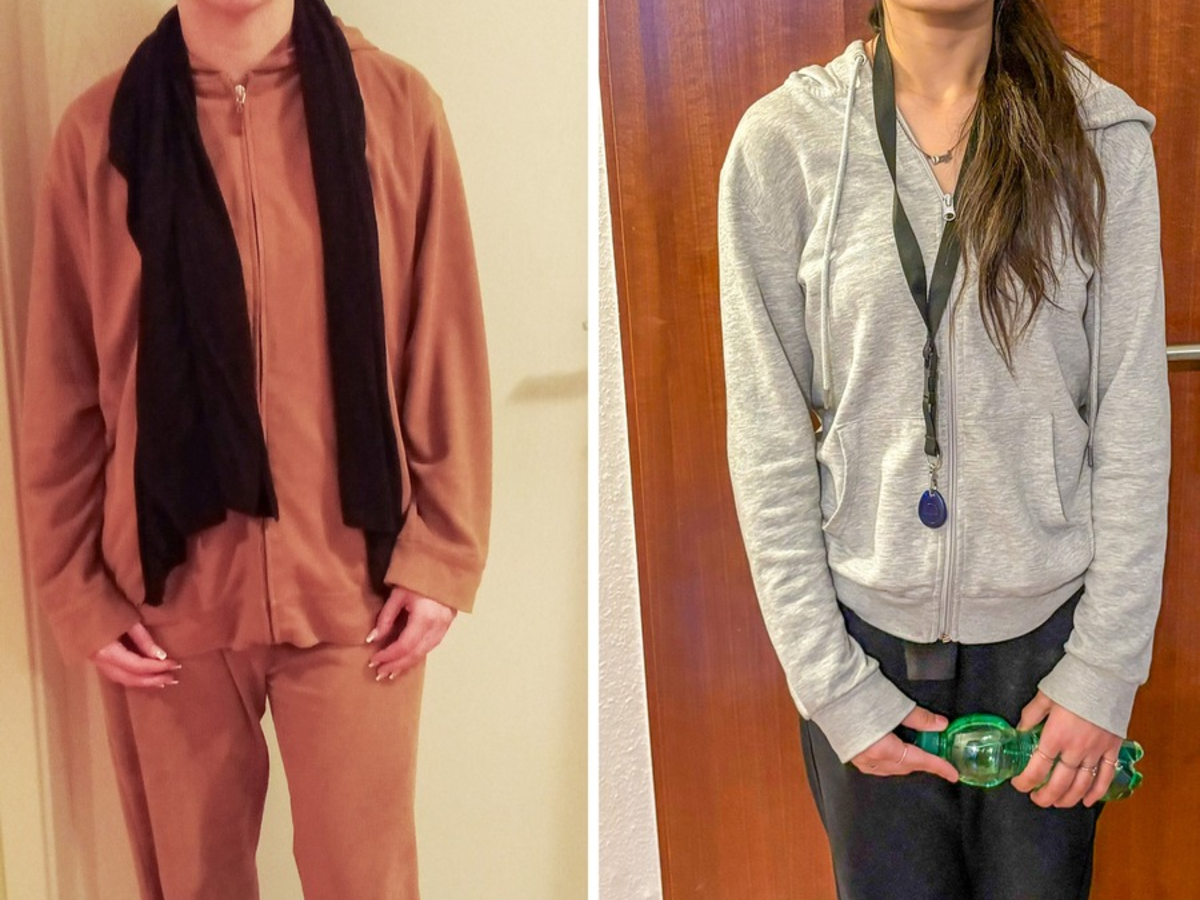 Rabia ist ähnlich groß, etwa 163cm, und auch schlank. Sie hat schulterlange, braune Haare, die vorne über der Stirn aber deutlich kürzer sind. Wie auf dem Bild trägt sie darüber immer ein Tuch oder eine Kapuze, zudem trägt sie eine goldfarbene Brille. Bekleidet ist sie vermutlich mit einer weißen Sweatjacke, einer grauen Cargohose und weißen Nike-Turnschuhen.