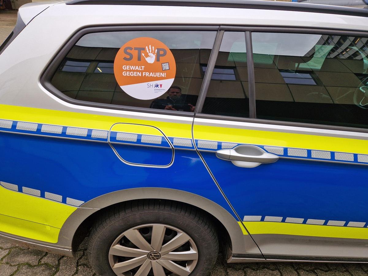 Ab dem 25.11.2024 und der sich unmittelbar anschließenden Orange Days, die bis zum Tag der Menschenrechte am 10. Dezember andauern, werden die Dienstgebäude und Funkstreifenwagen in Lübeck und Ostholstein mit einem orangefarbenen Aufkleber mit dem Schriftzug "STOP GEWALT GEGEN FRAUEN" versehen. Zudem befindet sich auf dem Aufkleber einen QR-Code, der auf die Seite "Schutz vor Gewalt" der Landesregierung verweist. Ziel der Kampagne ist es, die Öffentlichkeit zu informieren, zu sensibilisieren und auf das Thema (Ex-)-Partnerschaftsgewalt aufmerksam zu machen.