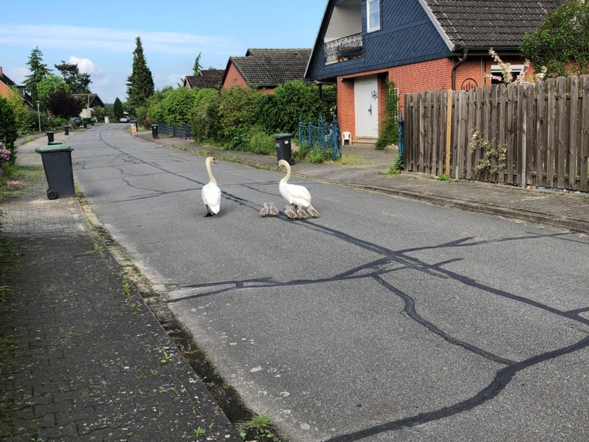 Melbeck - "Polizeiliche Begleitung" - Schwanenfamilie durch Wohngebiet zurück zum Teich geleitet