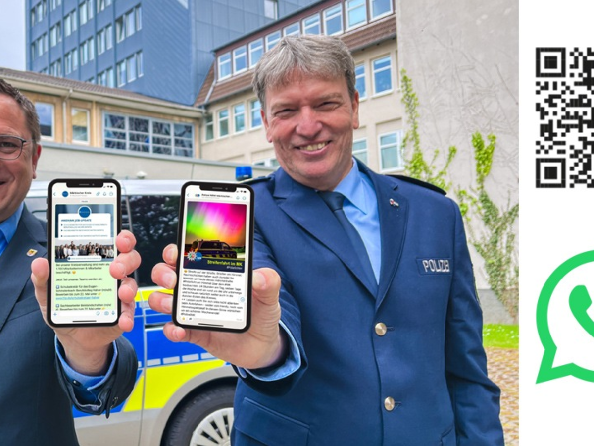 Zeitgleich mit der Polizei MK geht die Kreisverwaltung des Märkischen Kreises bei WhatsApp an den Start. Landrat Marco Voge und der Abteilungsleiter Polizei, Ralf Wagener, drückten symbolisch den Startknopf für die beiden Channels. Marco Voge sagt: "Mit dem neuen WhatsApp-Kanal möchten wir viele Menschen direkt erreichen. Im digitalen Alltag wollen wir mit einem zeitgemäßen Informationsangebot präsent sein. Alle Bürgerinnen und Bürger sind eingeladen, dieses neue Angebot zu nutzen. Besonders in Notfällen und in Krisensituationen können wir hier schnell informieren." Der Leitende Polizeidirektor Ralf Wagener erklärt: "Sich über soziale Medien mit Informationen zu versorgen, ist heute selbstverständlich. Das wollen wir als Polizei nutzen, um transparent, zuverlässig und schnell über wichtige Ereignisse und unsere tägliche Arbeit aufzuklären. Dazu gehören manchmal auch bunte Geschichten aus dem Alltag."