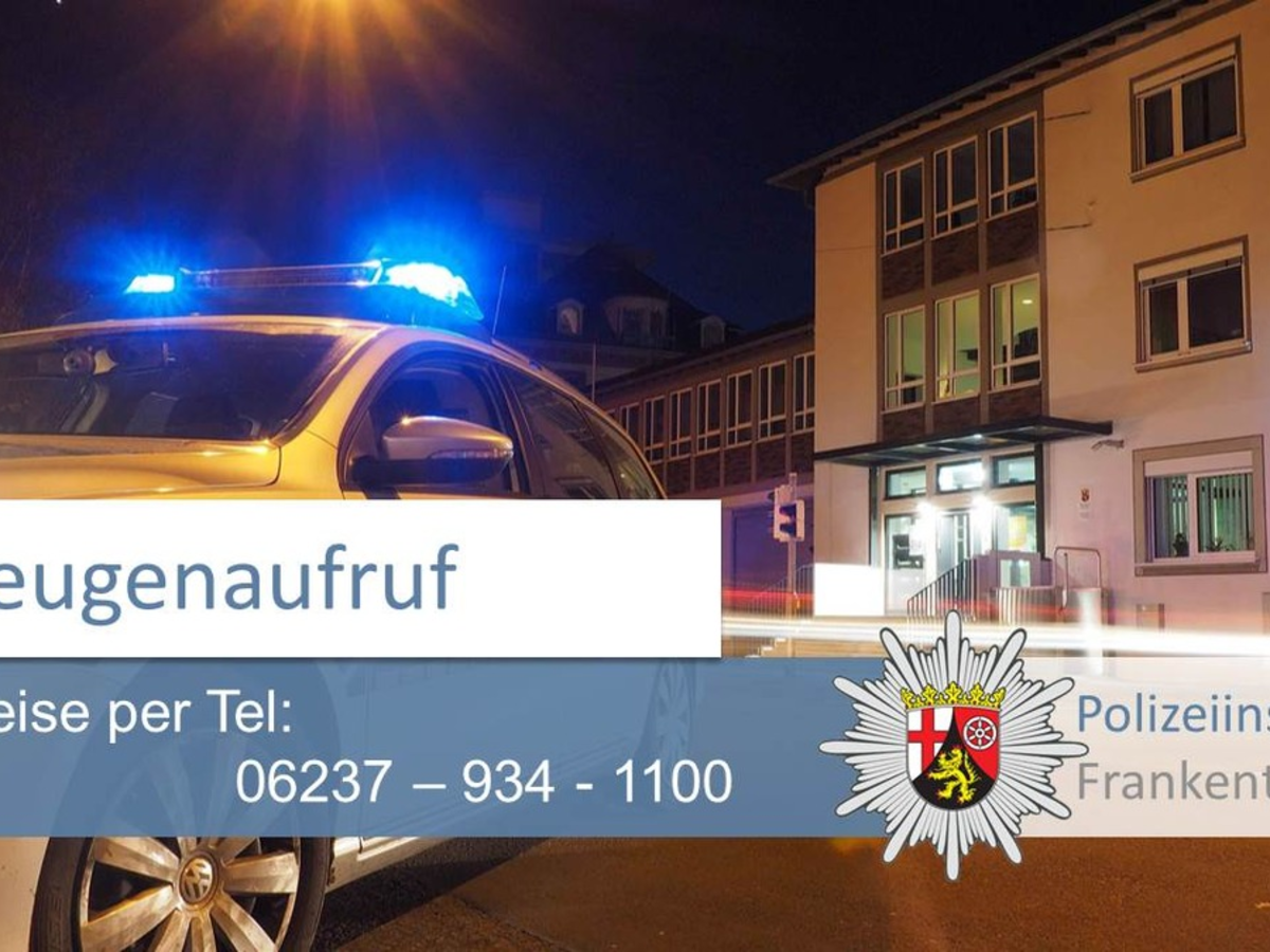 07.06.2024 - 20:34:15 | presseportal.deZeugen werden gebeten sich an die Polizeiinspektion Frankenthal unter der Tel.-Nr.: 06233/313-0 oder an die Polizeiwache Maxdorf unter der Tel.-Nr.: 06237/934-1100 zu wenden. Gerne nehmen wir Ihre Hinweise auch per E-Mail unter pwmaxdorf@polizei.rlp.de entgegen.