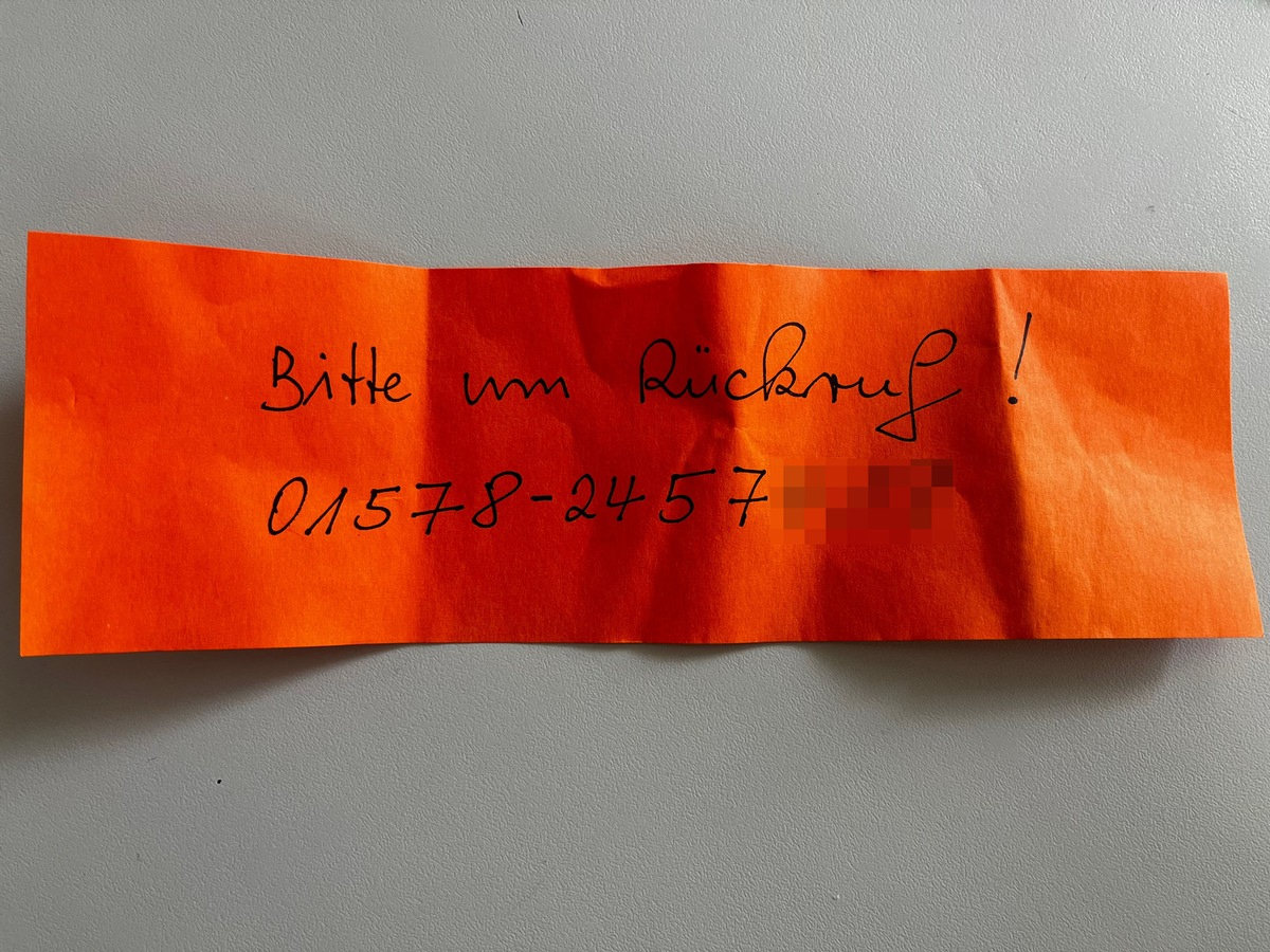 23.07.2025 - 13:53:48 | presseportal.deEine Frau aus Meerbusch erschien heute (23.07.) auf der Polizeiwache an der Holbeinstraße in Büderich, nachdem sie zuvor eine rätselhafte Notiz an ihrem Fahrzeug gefunden hatte. Der Text auf dem orangfarbenen Zettel: Bitte um Rückruf! und die Telefonnummer 01578 - 2457xxx.