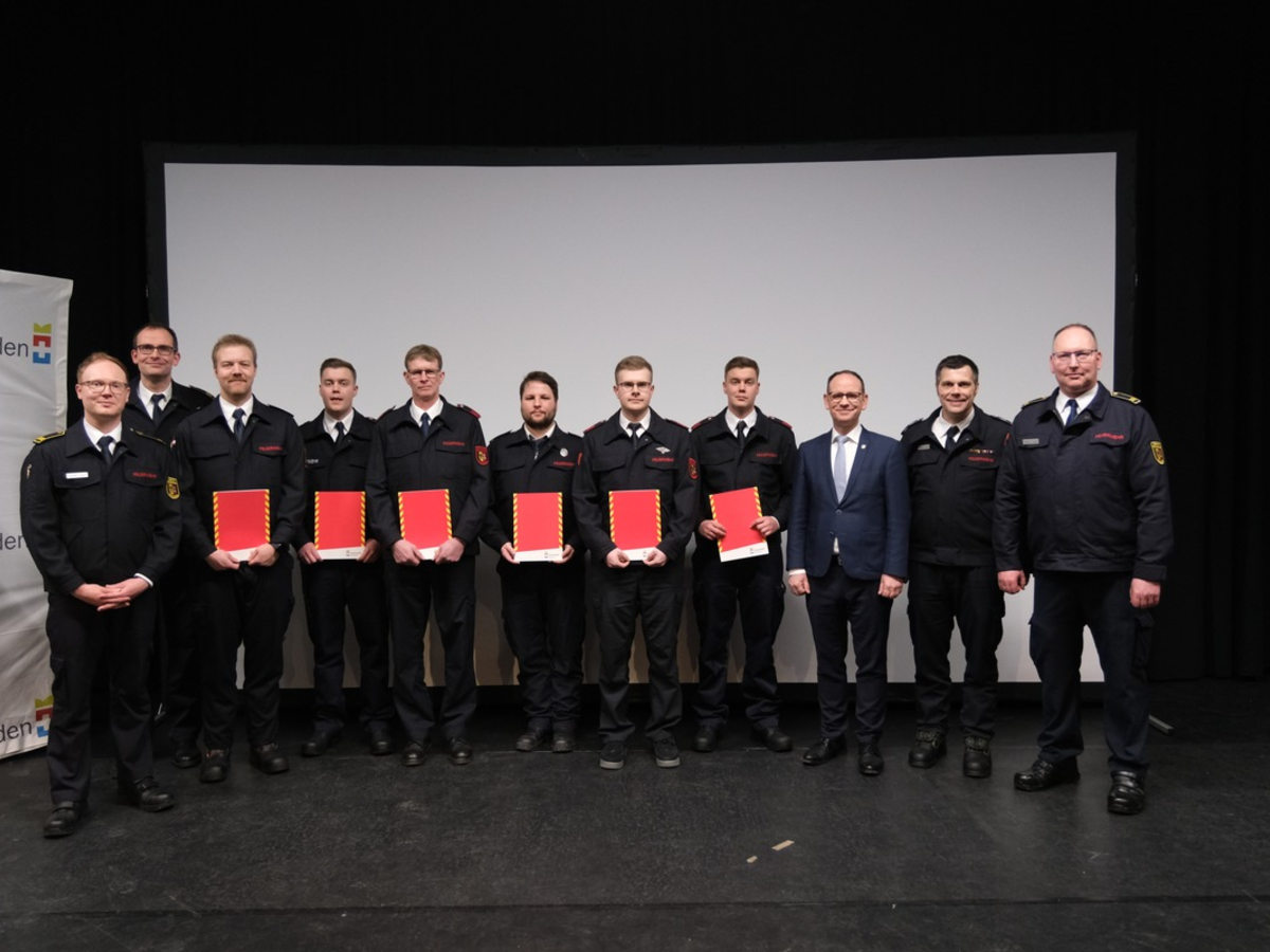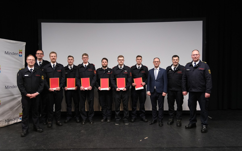 Zehn Feuerwehrangehörige wurden für ihre langjährige Mitgliedschaft ausgezeichnet. Eine besondere Ehrung erhielt der sichtlich überraschte Jürgen Stockmann: Für seine herausragenden Verdienste um die Feuerwehr Minden, u.a. als langjähriger Einheitsführer Haddenhausen, als Sprecher der Freiwilligen Feuerwehr und zuletzt als Mitinitiator und Triebkraft der Werbekampagne, wurde ihm durch den Kreisbrandmeister Thomas Podschadly das Deutsche Feuerwehr-Ehrenkreuz in Silber des deutschen Feuerwehrverbandes verliehen.