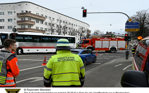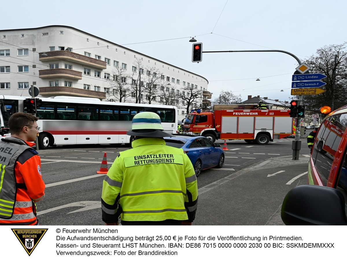 Ein mit 22 Kindern und Begleitpersonen besetzter Bus war stadteinwärts auf der Arnulfstraße unterwegs, als er im Bereich des Steubenplatzes mit einer Straßenbahn kollidierte, welche stadtauswärts fuhr. Bei dem Zusammenstoß im Kreuzungsbereich wurde der Bus an der Front schwer beschädigt, die Trambahn entgleiste. Bei Eintreffen der ersten Einsatzkräfte bot sich ein zunächst unübersichtliches Bild, da einige Personen bereits die Fahrzeuge verlassen hatten. Insgesamt mussten zwölf Beteiligte vom Rettungsdienst versorgt und untersucht werden. Dabei handelte es sich um acht Kinder und vier Erwachsene. Nach den ersten Maßnahmen vor Ort musste der 62-jährige Busfahrer mit schwereren und zwei elfjährige Buben mit leichten Verletzungen in Münchner Kliniken gebracht werden. Die restlichen Betroffenen konnte die Einsatzstelle selbstständig verlassen oder wurden zur weiteren Betreuung mit dem Großraumrettungswagen der Berufsfeuerwehr in ein nahegelegenes Gymnasium gebracht. Die Kinder konnten dort von den zwischenzeitlich informierten Eltern abgeholt werden. Die Feuerwehr unterstütze bei der Patientenversorgung, sicherte die Einsatzstelle ab und stellte den Brandschutz sicher. Abschließend wurden die Verkehrsbetriebe beim Eingleisen der Bahn mit dem Rüst- und Kranwagen unterstützt. Die MVG schleppte das Schienenfahrzeug im Anschluss in ein Depot ab. Zur Bergung des Busses war die Feuerwehr nicht mehr erforderlich und so konnten die letzten Kräfte gegen 15 Uhr die Einsatzstelle verlassen.