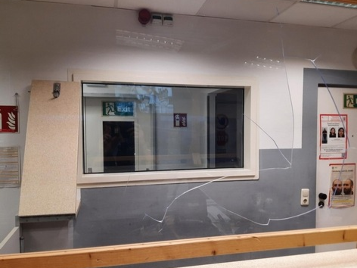 Der 40-Jährige beleidigten die Polizisten während der polizeilichen Maßnahmen. Da der Mann sehr aufgebracht war versuchten die Beamten ihn zu beruhigen; dieser zerstörte jedoch mit einem Kopfstoß die Spuckschutzscheibe in der Wache (siehe Bild).