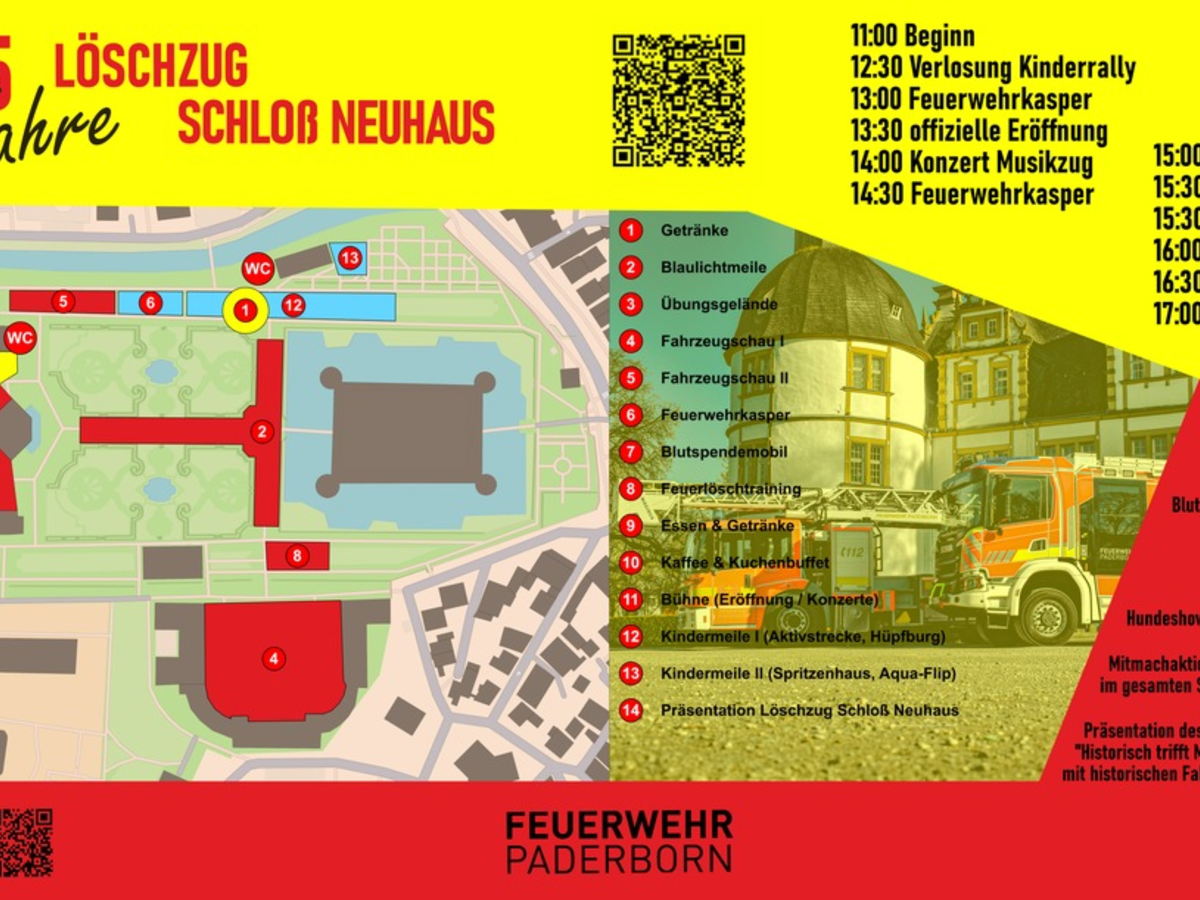 Parallel hierzu beginnt um 11:00 Uhr der Familientag des Löschzugs Schloß Neuhaus anlässlich seines 125-jährigen Bestehens. Der Löschzug Schloß Neuhaus hat hierzu ein buntes Potpourri aus Mitmachaktionen für Groß und Klein und verschiedenen Vorführungen vorbereitet. Feuerwehr, Rettungsdienst, Polizei, THW, verschiedene Hilfsorganisationen und die Bundeswehr gewähren mit einer umfangreichen Ausstellung und Infoständen einen interessanten Einblick in ihre Arbeit. Selbstverständlich ist auch für das leibliche Wohl gesorgt. Die Feuerwehr Paderborn freut sich auf den Besuch vieler Menschen.
