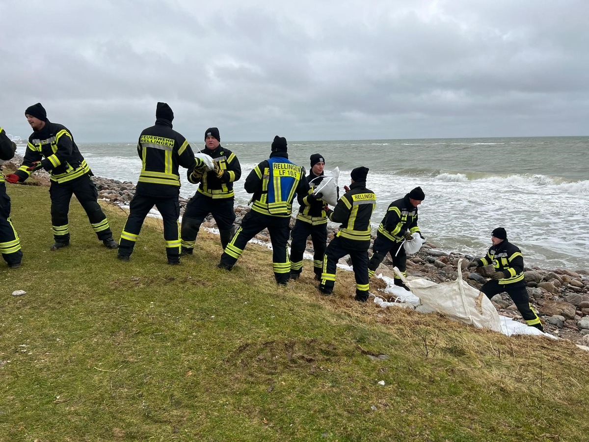 Pinneberg - Am vergangenen Donnerstag, den 26.10.2023 wurde die kommunale Feuerwehrbereitschaft des Kreisfeuerwehrverbandes Pinneberg zur Unterstützung in den Kreis Schleswig-Flensburg alarmiert. Durch diese Alarmierung verlegten 115 Kameradinnen und Kameraden der Wehren aus Appen, Halstenbek, Pinneberg, Kummerfeld, Rellingen, Schenefeld, Quickborn, Seeth-Ekholt, Kölln-Reisik, Barmstedt, Kl. Offenseth-Sparrieshoop, Bilsen sowie Borstel-Hohenraden in den Bereich Hasselberg - nördlich von Maasholm. In Hasselberg hat die Sturmflut auf einer Strecke von fünf Kilometern viele Abbruchkanten in den Deich gespült. Die eingesetzten Kameradinnen und Kameraden lösten vor Ort die Einsatzkräfte der Feuerwehr Kiel ab. Unter der Einsatzleitung der Kreisbereitschaftsführung in Funktion von Daniel Dähn und Christof Fehrs aus der Feuerwehr Quickborn sowie Lorenz Groth aus der Feuerwehr Borstel-Hohenraden galt es, die Lücken im Deich in enger Zusammenarbeit mit dem Technisches Hilfswerk und dem Landesbetrieb für Küstenschutz, Nationalpark und Meeresschutz Schleswig-Holstein mit Fließ und Sandsäcken zu stopfen. Durch die hohe körperliche Anstrengung sowie die Wetterlage von 10°C, vereinzelten Regenschauer und 30 km/h Wind brachten die Arbeiten direkt an der Ostseeküste streckenweise ihre Herausforderung mit sich. Parallel wurden die Einsatzkräfte aus dem Kreis Pinneberg an der Feuerwache in Gelting eingesetzt. Dort galt es mithilfe einer Sandsack-Befüllmaschine zahlreiche Sandsäcke zu befüllen und auf Paletten zu lagern. Die Paletten wurden anschließend durch das Technische Hilfswerk an die entsprechenden Deichbereiche verlegt. Nach über 16 Stunden Einsatzdauer kehrten alle Kameradinnen und Kameraden erschöpft aber gesund an die Kreisfeuerwehrzentrale in Tornesch-Ahrenlohe zurück. Der stellvertretende Kreisbrandmeister Stefan Mohr nahm die eintreffenden Einsatzkräfte in Empfang und bedankte sich bei allen für die Einsatzbereitschaft. Durch die Kräfte der DRK Betreuungsgruppe Elmshorn wurde anschließend ein kleiner Imbiss gereicht.