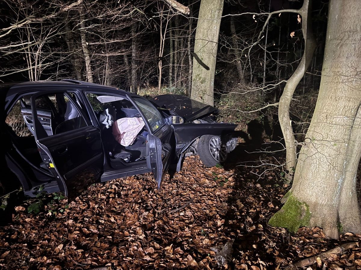 Dieser ignorierte die Anweisungen der Polizei jedoch und fuhr mit deutlich überhöhter Geschwindigkeit auf die A52 in Richtung Essen davon. Die Verfolgungsfahrt setzte sich anschließend über die A524 in Richtung Krefeld fort. An der Anschlussstelle Lintorf flüchtete der Fahrer mit den beiden weiteren Tatverdächtigen in seinem Auto über die Bissingheimer Straße in ein angrenzendes Waldgebiet. Im Bereich der Einmündung Lintorfer Waldweg/Druchter Weg auf Duisburger Stadtgebiet verlor er hierbei die Kontrolle über seinen Volvo und prallte frontal gegen einen Baum. Die drei Tatverdächtigen setzten daraufhin ihre Flucht zu Fuß fort, konnten aber kurze Zeit später durch die Einsatzkräfte festgenommen werden.