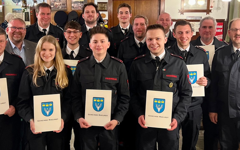 Auf der Agenda standen Einblicke des Fördervereins, Wahlen, interne Abstimmungen und natürlich die Jahresberichte von Bürgermeister, Wehrleitung und Löscheinheitsführung. Frank Diepers verlas den satte 31 Seiten langen Jahresbericht 2023 der Löscheinheit. Dieser gestaltete sich aufgrund der diversen Aktivitäten, insgesamt 25 erfolgreich abgearbeiteten Einsätze sowie tausender geleisteter Stunden aller Kamerad:innen in sämtlichen Bereichen der Feuerwehr durchaus kurzweilig. Er zeigte einmal mehr, dass die Arbeit der Feuerwehr längst nicht mehr nur aus dem abwehrenden Brandschutz besteht. Seminare und Lehrgänge hier, Öffentlichkeitsarbeit da, Kinder- und Jugendarbeit auf der einen, Brauchtumspflege und kameradschaftliche Aktivitäten auf der anderen Seite. Das Aufgabenspektrum der Feuerwehr ist divers und wird gewiss immer diverser. So flossen im Jahr 2023 insgesamt knapp 1500 Stunden allein in Seminare und Lehrgänge unterschiedlicher Natur, weitere rund 2250 Stunden leisteten die Kamerad:innen im Bereich der regulären Aus- und Weiterbildung bei den Dienstabenden. Mit dem leidenschaftlichen Einsatz, der auch in der starken Jugend- und Kinderfeuerwehr für uns mit den Heranwachsenden zwischen 6 und 17 Jahren betrieben wird, summieren sich die ehrenamtlich geleisteten Stunden auf fast 10.000. Dass diese unentgeltliche Arbeit nicht selbstverständlich werden darf, bekräftigte Diepers in seinen abschließenden Worten. Immer wieder komme es vor, dass Bürgerinnen und Bürger bei Einsätzen oder öffentlichen Veranstaltungen wie selbstverständlich davon ausgingen, dass die Feuerwehr hauptamtlich organisiert sein. Daran knüpfte auch Bürgermeister Dirk Ketelaers an, indem er den Kamerad:innen für ihre Leidenschaft im Namen aller Bürger:innen herzlich dankte. Er verglich die Einsatzkräfte der Feuerwehr passenderweise mit einem Airbag: "Ihr seid verlässlich, sicher, immer da, aber am besten ist es, wenn man euch nicht braucht." So sei er immer froh, wenn man die Einsatzfahrzeuge nicht mit Martinhorn ausrücken hört - dann ginge es den Bürger:innen gut und die Einsatzkräfte müssten sich nicht in Gefahr bringen. "Doch wenn ihr ausrückt, habe ich ein sicheres Gefühl, weil ich weiß, dass ihr kompetent und leidenschaftlich auftretet", so Ketelaers weiter. Schließlich nahmen Bürgermeister Dirk Ketelaers, Einheitsführer Frank Diepers und der stellvertretende Leiter der Feuerwehr Ralf Thier gemeinsam Beförderungen vor, die sich die Kamerad:innen entweder durch abgeschlossene Lehrgänge oder geleistete Dienstzeiten verdient hatten.