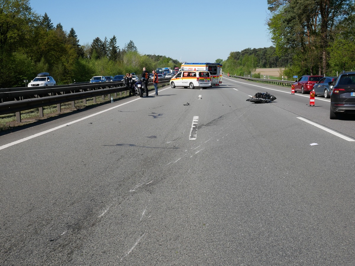 ++ Verkehrsunfall auf BAB 1 - zwei Motorradfahrer schwer verletzt ++ Am 26.04.2025 um 10:18 Uhr kam es auf der Bundesautobahn (BAB) 1 zwischen der Anschlussstelle Rade und der Rastanlage Hollenstedt zu einem folgenschweren Verkehrsunfall. Eine Gruppe von Motorradfahrern war unterwegs in Fahrtrichtung Bremen als einer auf den anderen auffuhr und schließlich gegen einen in gleicher Richtung fahrenden Pkw stieß. Der zweite Motorradfahrer wur-de durch den Aufprall gegen die Mittelschutzplanke geschleudert. Die beiden Motorradfahrer (34 und 35 Jahre alt) wurden bei dem Unfall schwer verletzt und in ein Krankenhaus eingeliefert. Der Fahrzeugführer des Pkw blieb unverletzt. Die BAB 1 war zwischenzeitlich vollgesperrt (siehe Bild). Die Ermittlungen zum Unfallhergang dauern an. Es wurde ein Ermittlungsverfahren gegen den Hauptverursacher eingeleitet.