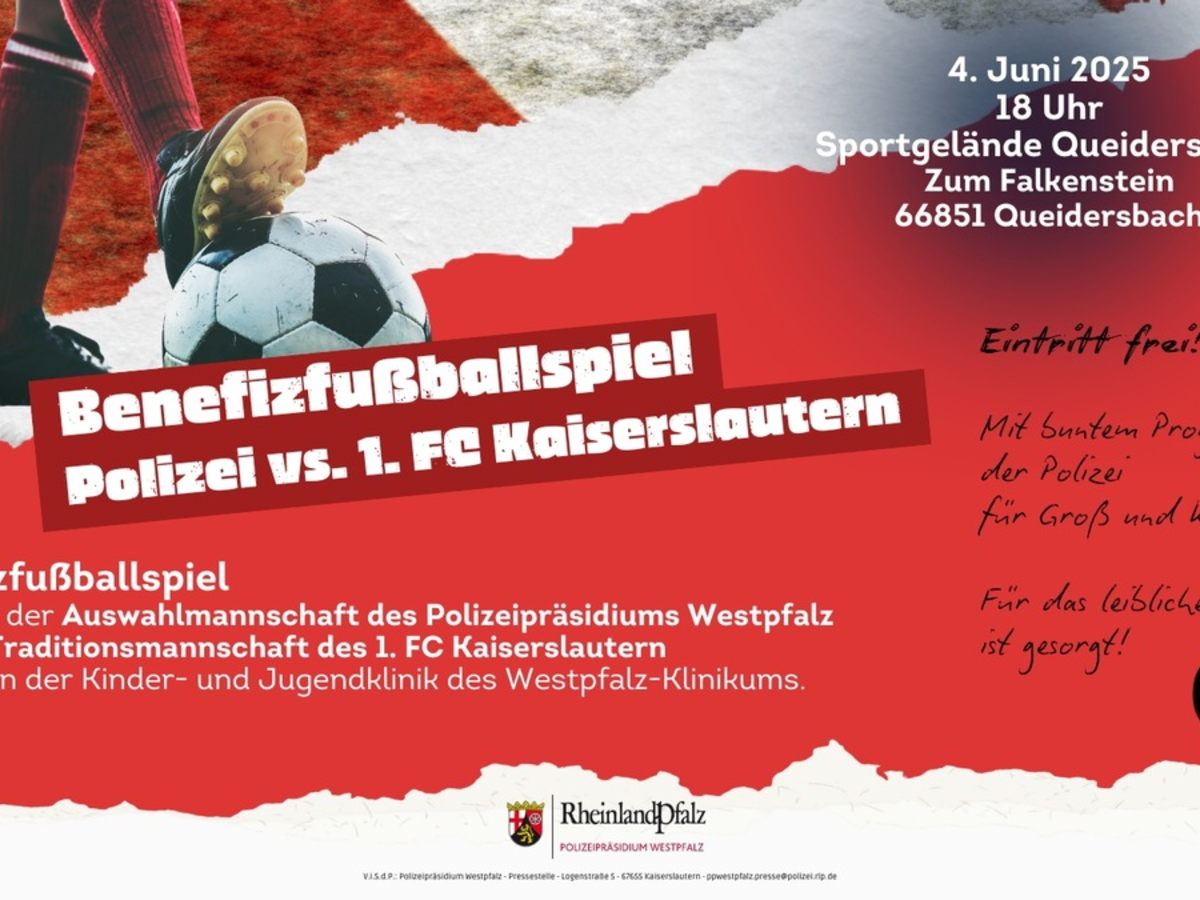 Queidersbach (Kreis Kaiserslautern) - Die Auswahlmannschaft des Polizeipräsidiums Westpfalz und die Traditionsmannschaft des 1. FC Kaiserslautern laden am Mittwoch, 4. Juni 2025, zum Benefizfußballspiel ein. Anpfiff auf dem Sportgelände in Queidersbach ist um 18 Uhr. Der Eintritt ist frei. Die Fußballer der Polizei und ehemaligen Profis der Roten Teufel treffen nach längerer Pause wieder aufeinander, um für einen guten Zweck zu kicken. In diesem Jahr rollt das Leder zugunsten der Kinder- und Jugendklinik des Westpfalz-Klinikums in Kaiserslautern. Rund um das Spiel sorgt ein kunterbuntes Programm der Polizei für Abwechslung und Unterhaltung für große und kleine Fans. Auch für das leibliche Wohl ist gesorgt. Die Veranstalter freuen sich über zahlreiche Gäste und großzügige Spenden. |erf