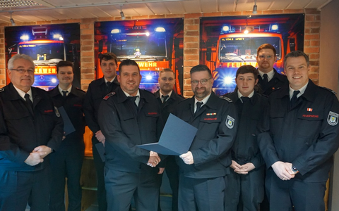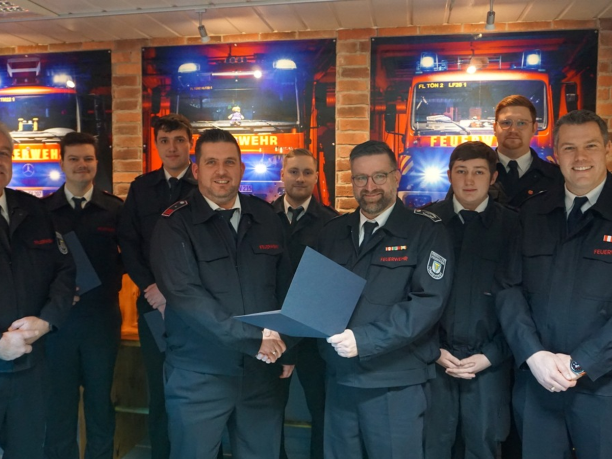 Nach den Grußworten und dem Gendenken an verstorbene Kameraden erfolgten sechs Beförderung durch Feuerwehrchef Griese. Mit der erfolgreichen Beendigung des Probejahres wurden Laurenz Hinskes und Simon Schmitz zu Feuerwehrmännern ernannt. Durch einen erfolgreiche Teilnahme an weiterbildenden Lehrgängen auf Stadt- und Kreisebene konnten Frederik Zint und Jonas Püllen zu Oberfeuerwehrmännern, Jonas Backes zum Unterbrandmeister befördert werden. Stephan Kottal wurde zum Hauptbrandmeister ernannt.
