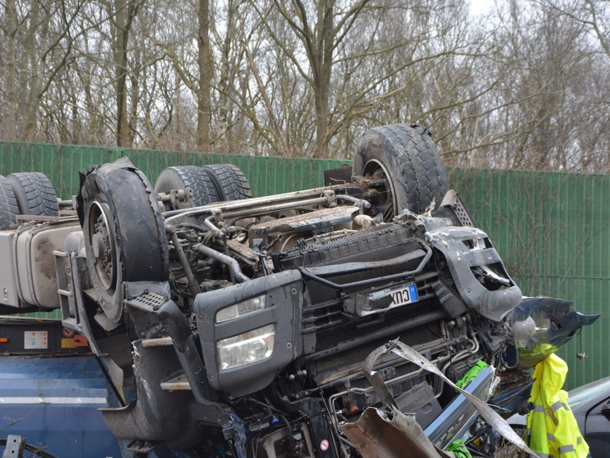 14.02.2025 - 15:19:22 | presseportal.deBremerhaven / BAB 27. Am 14.02.2025, ereignete sich gegen 10.45 Uhr auf der A27, etwa 500 Meter vor der Anschlussstelle Bremerhaven-Überseehäfen, ein Verkehrsunfall zwischen einem Sattelzug und einem PKW. Der 57-jährige LKW-Fahrer und die 41-jährige PKW-Fahrerin, beide aus dem Landkreis Cuxhaven, wurden bei dem Unfall leicht verletzt. Die Autobahn musste in Folge des Unfalls zwischen den Anschlussstellen Geestland-Debstedt und Bremerhaven-Überseehäfen voll gesperrt werden. Die Sperrung wird für die Bergungs- und Aufräumarbeiten noch einige Zeit bestehen bleiben. Beide beteiligten Fahrzeuge fuhren in Richtung Bremerhaven, der LKW auf dem Hauptfahrstreifen, der PKW neben dem LKW auf dem Überholfahrstreifen. Bei der Sattelzugmaschine platzte der linke Vorderreifen und der Fahrer verlor die Kontrolle über sein Fahrzeug. Der Sattelzug brach nach links aus, stieß mit dem PKW zusammen und überschlug sich. Dabei prallte der LKW auf die Motorhaube des PKW, durchbrach die Mittelschutzplanke und kam quer über die Überholfahrstreifen beider Fahrtrichtungen auf dem Dach zum Stillstand. Beide Fahrzeuge wurden total beschädigt. Der Sattelanhänger war mit Kies beladen. Die Ladung verteilte sich auf der Autobahn. Der Sachschaden wird im hohen fünfstelligen bis niedrigen sechsstelligen Bereich liegen. Ein nachfolgender PKW fuhr über Trümmerteile und wurde beschädigt. Wie lange die Bergung der Fahrzeuge sowie die Aufräum- und Reinigungsarbeiten der Unfallstelle noch andauern werden, ist noch nicht abzusehen.