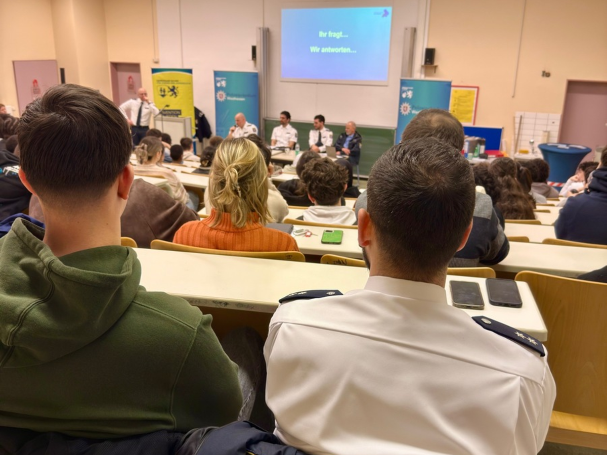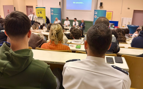 (kq)Am Dienstagmorgen fand in der Wilhelm-Leuschner-Schule in Wiesbaden-Kostheim eine Veranstaltung der Dialogreihe "Cops im Dialog - Polizei und Schule im Austausch" statt. Dieses Format ist Teil des "Respekt-Pakets" der Hessischen Landesregierung und zielt darauf ab, das gegenseitige Verständnis zwischen Jugendlichen und Einsatzkräften zu fördern sowie für ein respektvolles Miteinander zu sensibilisieren. Hier setzt die Polizei mit Transparenz und direktem Dialog an, um der jüngeren Generation ihre tägliche Arbeit und die damit verbundenen Herausforderungen näherzubringen.
