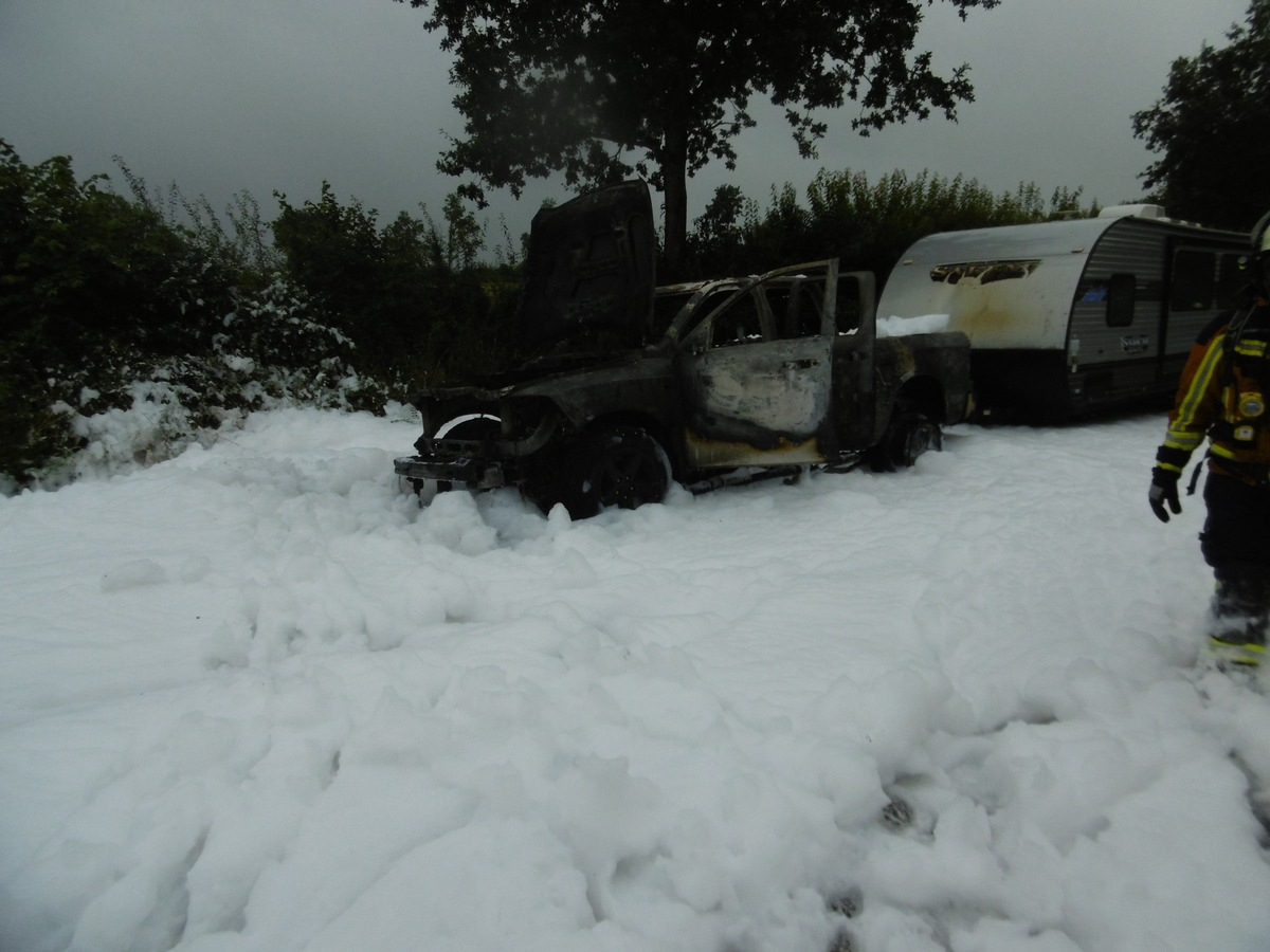 Der Pkw brannte vollständig aus. Ein angehängter Wohnwagen wurde zum Glück nur leicht im vorderen Bereich beschädigt.