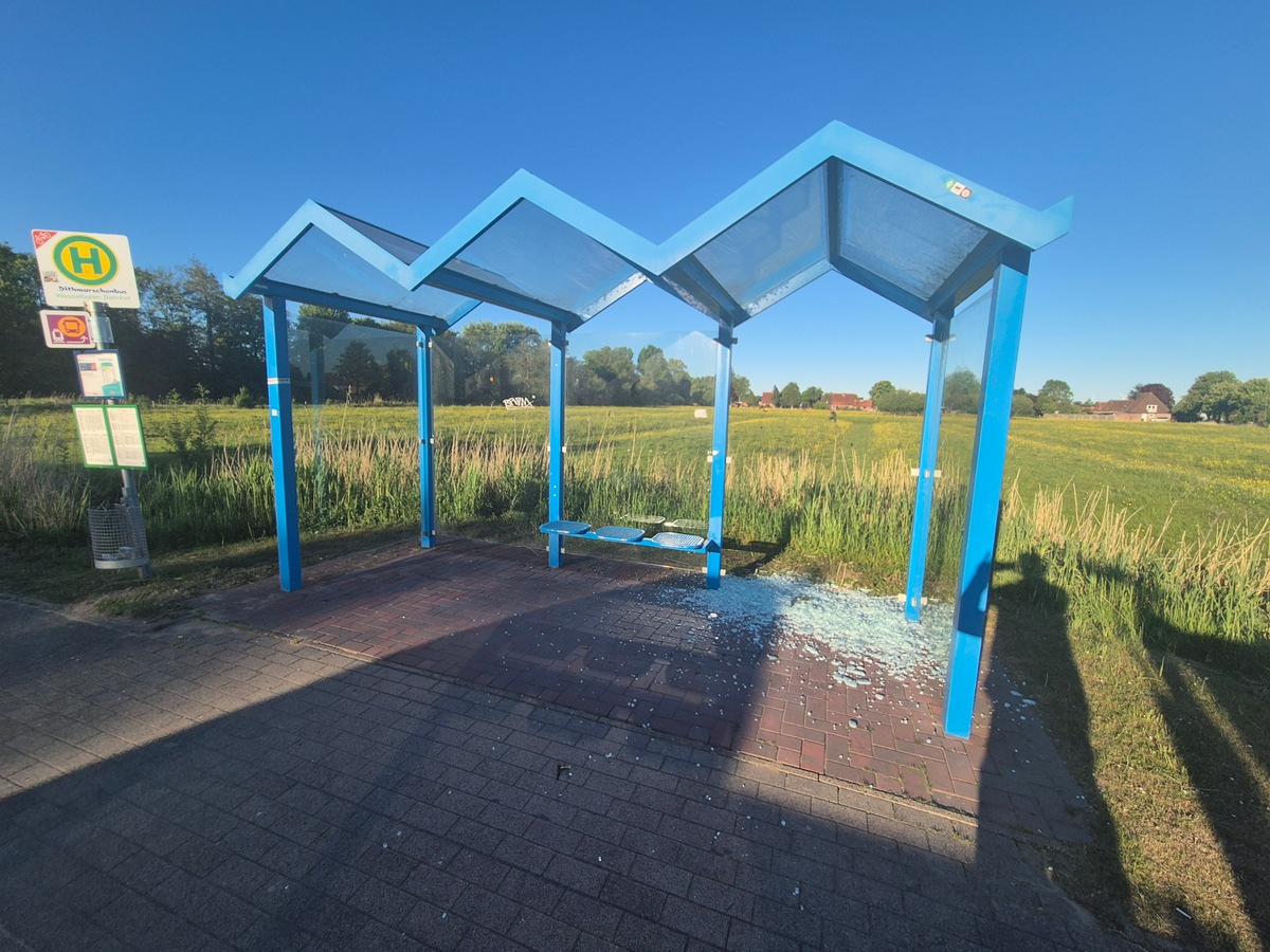 Zwischen Montag, dem 12. Mai, 15:30 Uhr, und Dienstag, dem 13. Mai, 06:20 Uhr, beschädigte eine unbekannte Person eine Scheibe der Bushaltestelle in der Bahnhofstraße, direkt gegenüber vom Bahnhof Wesselburen.