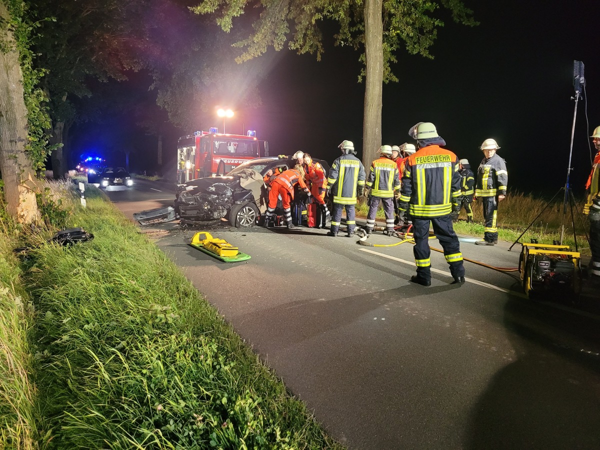 Vor Ort bestätigte sich die Lage, als die ersten Feuerwehrkräfte aus Wittorf am Einsatzort eintrafen. Der Fahrer eines Volkswagen Tiguan war mit seinem Fahrzeug von der Straße abgekommen und gegen einen Straßenbaum geprallt. Dadurch wurde das Fahrzeug so beschädigt, dass er es nicht mehr selbst verlassen konnte. Eingeklemmt war der junge Fahrer allerdings nicht.