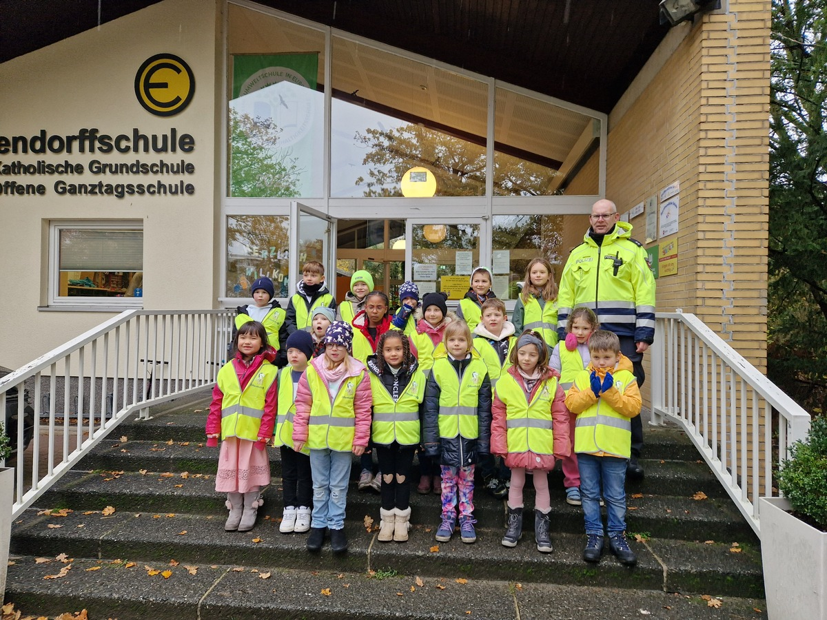 Im Anschluss konnte der Kontaktbeamte der Eichendorff-Grundschule, Polizeioberkommissar Jens Oertelt, den praktischen Teil des Fußgängerdiploms durchführen. Hier wurden den Schülerinnen und Schülern die Gefahren im Straßenverkehr nähergebracht und darüber hinaus auch das richtige Verhalten am Fußgängerüberweg geübt. "Es ist immer wieder schön zu sehen, wie die Kinder in der kurzen Zeit die Verkehrszeichen erlernen", so Jens Oertelt. Gemeinsam mit den Lehrkräften der Grundschule weist die Polizei immer wieder darauf hin, dass die Eltern die Regeln im Straßenverkehr unbedingt vorleben und weiter mit den Kindern vertiefen sollten. Gerade jetzt, in der dunklen Jahreszeit, ist es besonders wichtig, dass die Schulkinder helle und reflektierende Kleidung tragen um besser gesehen zu werden.