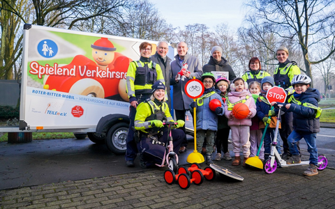 Gelsenkirchen - Jede Menge los war am Freitagmorgen, 31. Januar 2025, in der Jugendverkehrsschule in Gelsenkirchen-Buer. Kleine Kinder rollen auf nagelneuen Laufrädern durch die Spielstraßen, neue Verkehrsschilder regeln die Verkehrsströme, Bälle laden zum Spielen ein, Stelzen und verschiedene Motorik-Spiele stehen bereit. All diese Dinge sind Inhalt des "Roter Ritter"-Mobils, das der Vorsitzende des Vereins TEILEn e.V., Franz-Werner Drees, und das Gelsenkirchener Vereinsmitglied Stefan Sendatzki nun offiziell an die Polizei Gelsenkirchen übergeben haben. Gelsenkirchens Polizeipräsident Tim Frommeyer selbst hat es sich nicht nehmen lassen, sich bei der Übergabe persönlich bei den Initiatoren zu bedanken. "Mich begeistert dieses ehrenamtliche Engagement und ich bedanke mich ausdrücklich bei den Initiatoren. Mit dem Anhänger und seinem Inhalt haben die Mitarbeiterinnen und Mitarbeiter der Direktion Verkehr nun weit mehr Möglichkeiten, auf die vielfältigen Gefahren im Straßenverkehr aufmerksam zu machen. Das ist wichtig und wird sicher helfen, Gefahren im Straßenverkehr zu minimieren", so der Polizeipräsident. Franz-Werner Drees hat es sich zu einer Lebensaufgabe gemacht, mit seinem Verein, zu dem renommierte Autoteile-Hersteller und Großhändler wie Bosch, Hella oder die Bilstein-Group gehören, die Sicherheit von Kindern im Straßenverkehr zu verbessern. "Wir haben uns die Sicherheit von Kindern auf die Fahne geschrieben", so der 69-Jährige. Neben dem Verein TEILEn e.V. ist der Verein "Aktion Kinder-Unfallhilfe" Initiator des "Roter Ritter"-Mobils. Stefan Sendatzki, geschäftsführender Gesellschafter der Sendatzki + Rosenthal Autoteile und Lacke GmbH & Co. KG aus Gelsenkirchen, hat sich in diesem Fall gerne mitengagiert und die Investition in Höhe von 6000 Euro für den Anhänger in wesentlichen Teilen getragen. Die Polizei Gelsenkirchen wird den Anhänger ab sofort überall dort einsetzen, wo viele Kinder zusammenkommen und die Verkehrserziehung eine Rolle spielt. Das sind neben den Jugendverkehrsschulen auch Straßenfeste, Aktionstage oder ähnliche Veranstaltungen.
