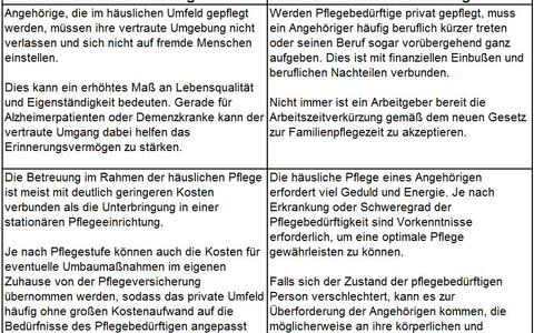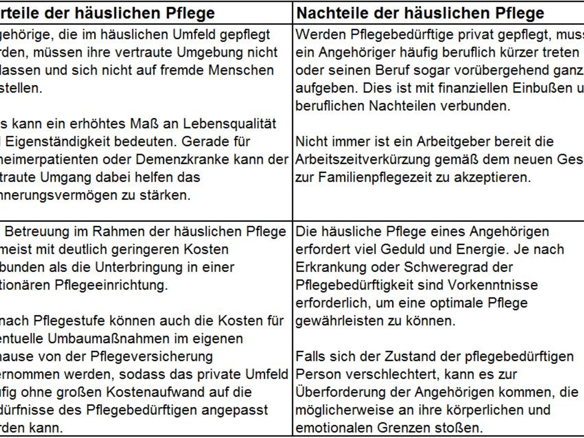 Rund 70 % der rund 2,5 Millionen pflegebedürftigen Menschen in Deutschland werden derzeit in häuslicher Pflege betreut. Dabei wird die Pflege teils von den Angehörigen selbst und teils von häuslichem Pflegepersonal übernommen. Wer seine Angehörigen selbst pflegt, muss häufig einen Großteil seines bisherigen Alltags an die neuen Umstände anpassen. Möglicherweise muss ein Angehöriger seinen Beruf aufgeben, um in ausreichendem Maße für einen pflegebedürftigen Elternteil da sein zu können. Dies bringt unter Umständen große finanzielle Einbußen mit sich und nicht selten geraten Angehörige dabei auch an ihre körperliche und emotionale Belastungsgrenze. Trotzdem ist die häusliche Pflege heute das verbreitetste Pflegemodell in Deutschland und das Anfang 2012 in Kraft getretene Gesetz zur Familienpflegezeit entlastet pflegende Angehörige zusätzlich. Diese dürfen jetzt per Gesetz ihre Arbeitszeit aus Gründen der häuslichen Pflege zwei Jahre lang auf einen Umfang von 15 Arbeitsstunden reduzieren. Eine vorherige Absprache mit dem Arbeitgeber ist allerdings nach wie vor erforderlich.