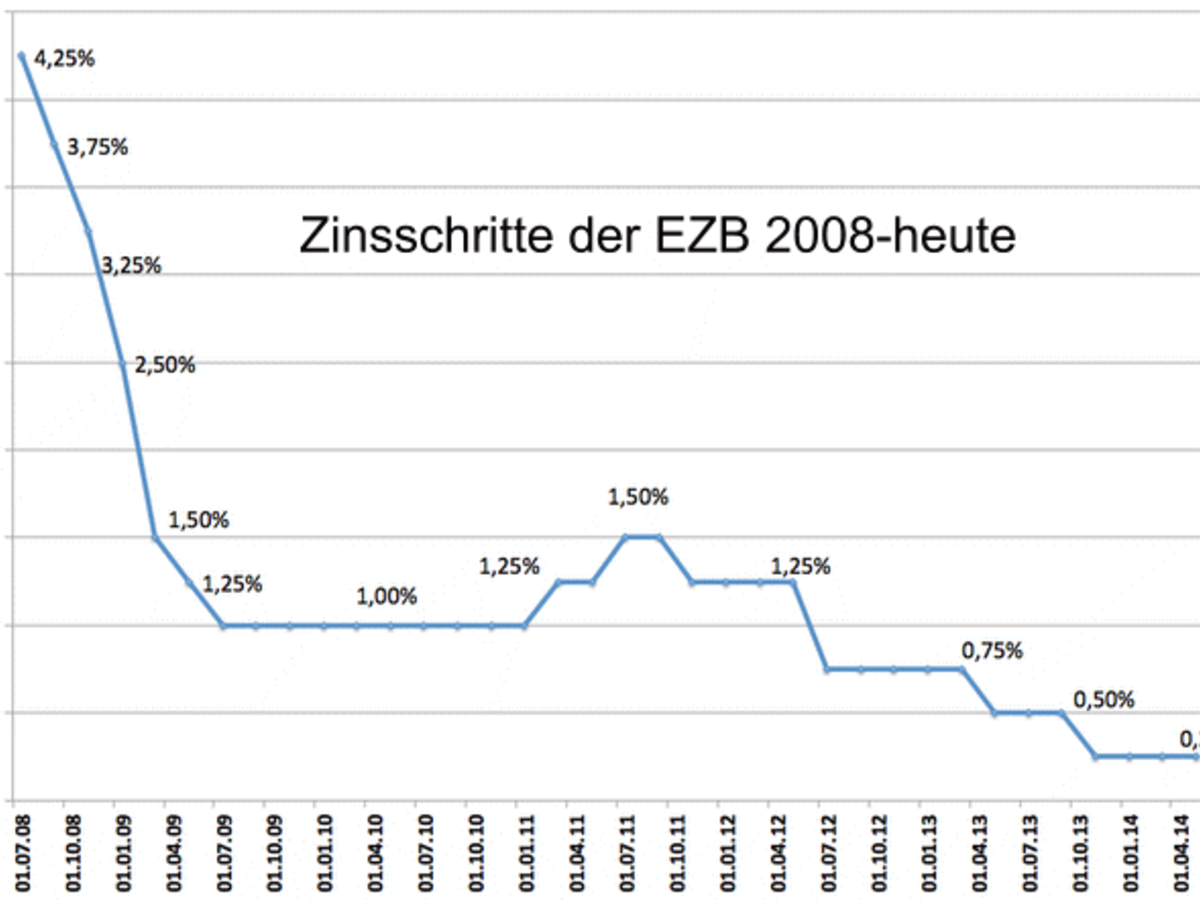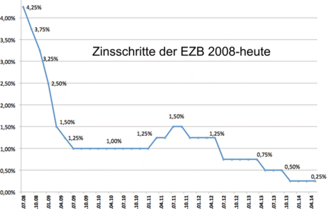 In der letzten EZB-Tagung am 08.05.2014 beschloss der EZB-Rat den Leitzins bei 0,25% zu belassen – noch. Im gleichen Atemzug wurde erwähnt, dass aufgrund der immer noch viel zu niedrigen Inflation, hoher Arbeitslosigkeit in den EU-Südstaaten und des zu starken Euro, ein weiterer Zinsschritt auf eventuell nur noch 0,1% im Juni denkbar ist.
