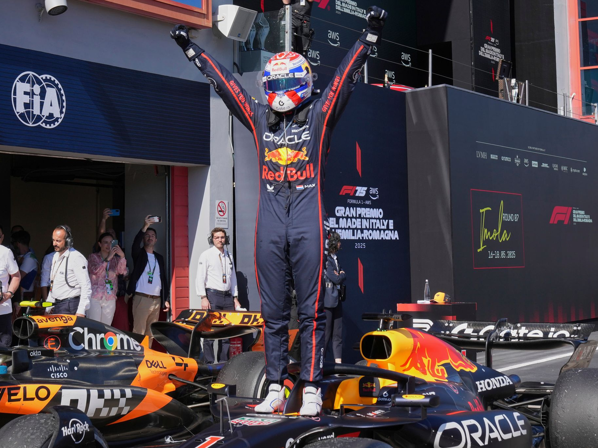 18.05.2025 - 17:02:01 | dpa.deIn Triumphpose kletterte Max Verstappen auf sein Siegerauto und nahm die Ovationen für seine Imola-Meisterleistung entgegen. Der Formel-1-Champion krönte den 400. Grand Prix seines Red-Bull-Teams im runderneuerten Dienstwagen mit seinem vierten Erfolg in der Emilia-Romagna nacheinander. Schon am Start hatte der Niederländer den WM-Spitzenreiter Oscar Piastri schwer düpiert. Der australische McLaren-Fahrer musste sich schließlich mit Rang drei begnügen, Zweiter wurde sein Stallrivale Lando Norris.
