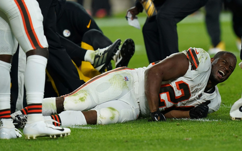 19.09.2023 - 07:14:51 | dpa.deNFL-Star Nick Chubb von den Cleveland Browns hat sich im zweiten Saisonspiel offensichtlich schwer am Knie verletzt. Beim 22:26 gegen die Pittsburgh Steelers konnte er schon früh im zweiten Viertel nicht mehr weiterspielen, nachdem er von Gegenspieler Minkah Fitzpatrick an den Beinen getroffen worden war und sich sein linkes Knie in einem extrem unnatürlichen Winkel verbogen hatte.